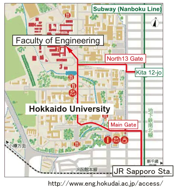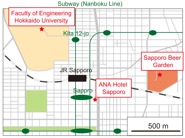 Transfer to Namboku line Subway from Sapporo station (5 min). After approximately 2 min, get off at Kita 12-jo Station and walk to the venue via Kita 13-jo gate for about 12 min.