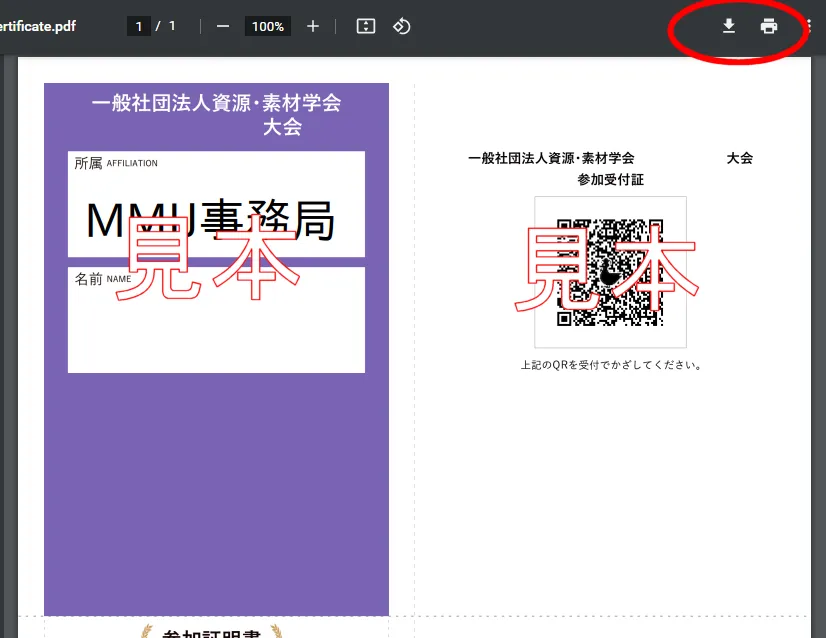 「参加証」をお忘れの場合、大会受付にて申込済みである事の証明ならびに白紙の「名札」に手書きで所属・氏名をご記入いただく必要がございます。 |