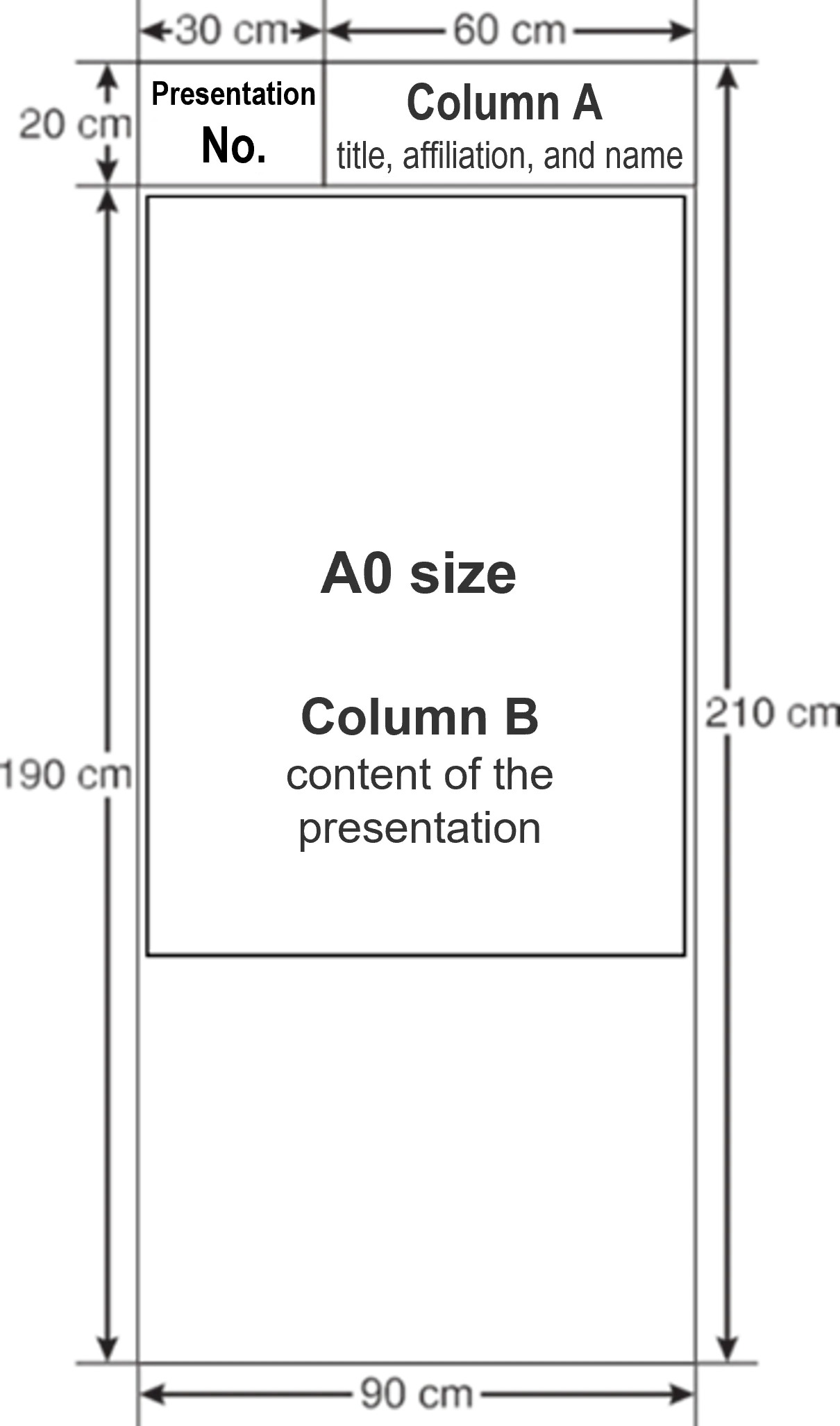 (b) Write the title, affiliation, and name of the presenter in column A, and the content of the presentation (A0 size) in column B. Please refer to the poster preparation manual poster preparation manual and use the template (paper size: 90 cm × 140 cm) for poster preparation. You can also add information to the web version (PDF file for the poster presentation) for the paper poster to be displayed on the day of the symposium.