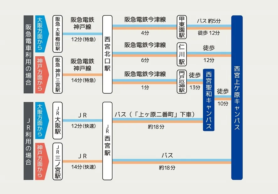 阪急仁川駅、阪急甲東園駅から西宮上ケ原キャンパスまでのルートは、以下をご参照ください。