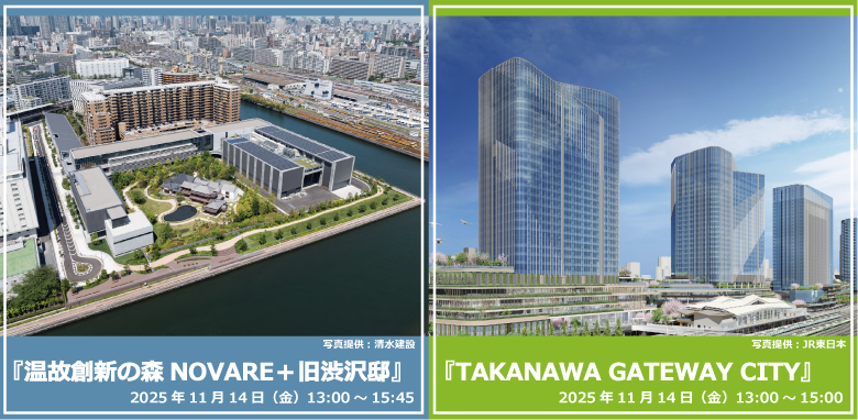 オープンイノベーション活動を促進するHub、技術研究所の一部機能が移転した研究施設・Lab、実物大モックアップによる体験型研修施設・Academy、清水建設所蔵の歴史的資料などを展示するArchives、渋沢栄一邸として二代清水喜助が手掛けた旧渋沢邸(江東区指定有形文化財)の5棟の建物で構成されるイノベーション創出の場「温故創新の森NOVARE」の施設見学を実施します。