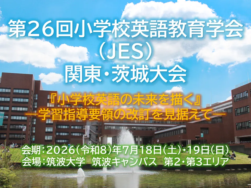 今夏,茨城県の筑波大学において,第27回小学校英語教育学会(JES)関東・茨城大会(全国大会)を開催致します。本大会では,学習指導要領の改訂が迫った時期に,現行の学習指導要領の成果や課題について振り返りつつ,これからの小学校英語について学会として語り合うべく,テーマを「小学校英語の未来を描く―学習指導要領の改訂を見据えて―」としました。皆様のご参加を心よりお待ち申し上げております。