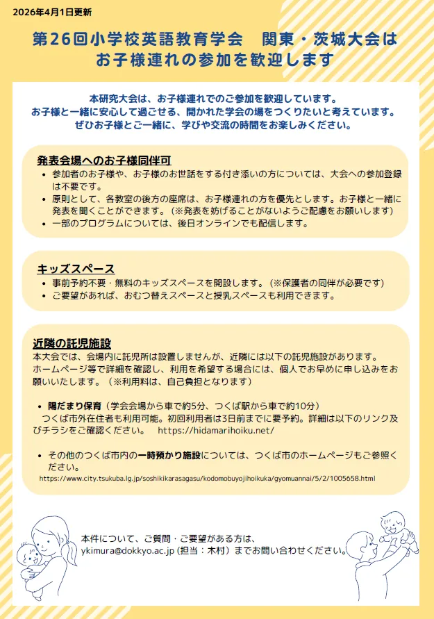 | 第26回 小学校英語教育学会 (JES) 関東・茨城大会事務局 〒305-8577 茨城県つくば市 天王台1-1-1 筑波大学人間系学系棟 名畑目真吾研究室内 E-mail: jes.kanto.ibaraki2026@gmail.com |