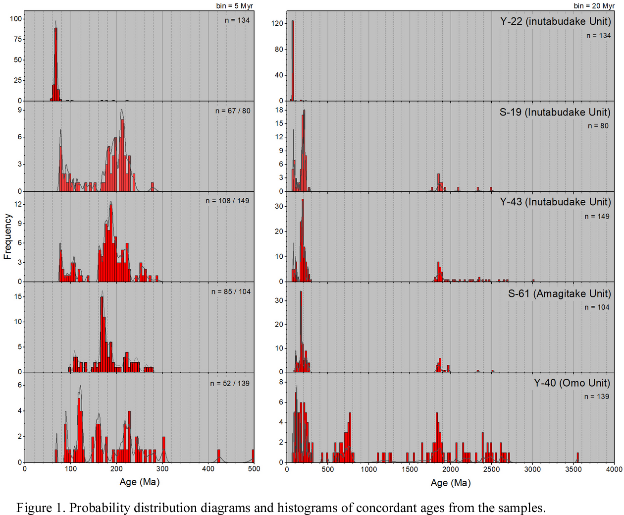 犬田布岳ユニットのうち2試料(S-19, Y-43)は2極的分布を持ち,YC1σはそれぞれ77.3 ± 0.7 Maと76.4 ± 0.6 Maを示した.この年代スペクトルは天城岳ユニットの非変成付加体砂岩のものと良く一致する.一方,試料Y-22だけは70 Ma弱の明瞭なシングルピークで特徴付けられ,YC1σは59.2 ± 1.0 Maを示した.