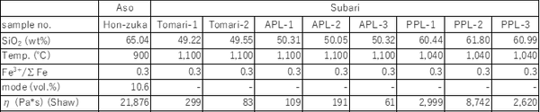 偽枕状溶岩中で共存する二種類の輝石について,Wells[4]による両輝石温度計で求めた温度は1,010~1,040℃であった。玄武岩質の枕状溶岩はこれよりも高温(1,100℃)とみなし,温度と全岩化学組成を用いてShaw[5]の式によりマグマの粘性を求めると,枕状溶岩は61~109 Pa・s,偽枕状溶岩は2,620~8,742 Pa・sという値を得た。枕状溶岩の値は,ハワイ諸島キラウェア火山のパホイホイ溶岩流の粘性(実測値)の380 Pa・s[6]に匹敵する。また,偽枕状溶岩の典型例として,阿蘇カルデラで報告された溶岩[7]について計算すると21,876 Pa・sであり,八峰町泊海岸の偽枕状溶岩はやや粘性が低い。 計算した粘性率をみると,玄武岩質枕状溶岩と安山岩質偽枕状溶岩では,2桁~3桁ほどの違いがある。粘性率が大幅に違うマグマは均質に混合することが困難であり[8],噴火時に苦鉄質包有物を形成しやすいことが知られる。本地域では同様な産状が見られなかったことから,両者のマグマは地下深部では同じ起源のマグマから分化したが,噴火時には近傍の異なる噴出源から流出したものと考えられる。