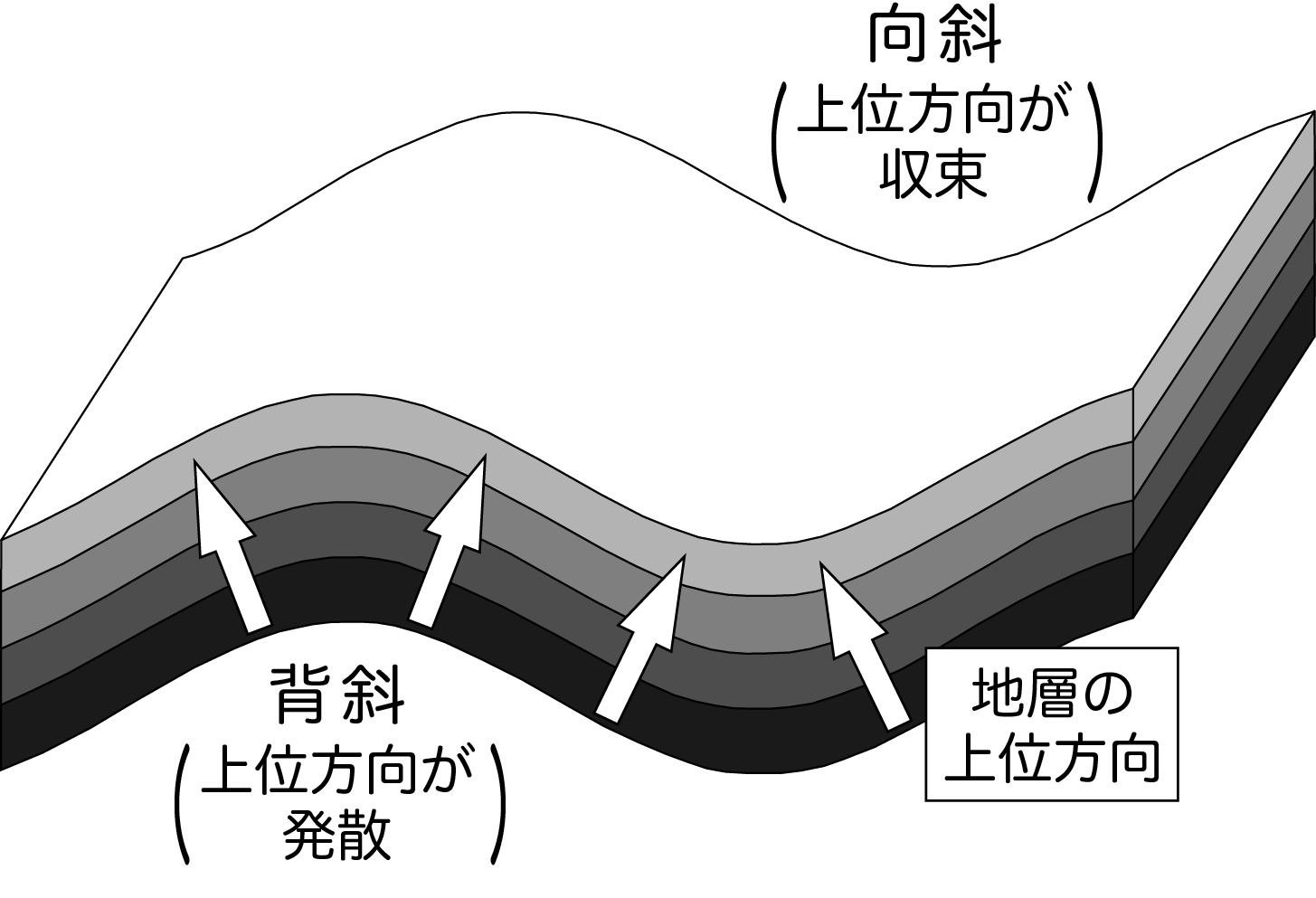 背斜と向斜を認定するポイントは、地層の層序的な上位方向と褶曲形状との関係である。背斜は上位方向が発散する(褶曲の軸部に背きあう)部分であり、向斜は上位方向が収束する(軸部に向きあう)部分である。高等学校教科書で扱う褶曲の模式図は、褶曲の模式図に地層の上位方向を矢印で示すことによって問題がなくなる(画像参照)。そして背斜は「地層の上位方向の矢印が発散する部分」、向斜は「地層の上位方向の矢印が収束する部分」と説明すればよい。このように説明することは、地層の層序的上位・下位方向と鉛直・水平を基準とした場合の上下(鉛直上方・鉛直下方)が異なる場合があることを生徒に意識させることにも繋がる。高等学校の地学教育では、背斜と向斜の意味を生徒が正しく理解できるように、今回提示する改善案を踏まえて教科書・学習参考書等を改訂する必要がある。