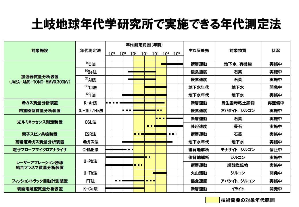 日本原子力研究開発機構東濃地科学センター土岐地球年代学研究所では、高レベル放射性廃棄物等の地層処分技術に関する研究開発の一環として地質環境の長期安定性に関する研究を実施している。この中で、地質試料を対象とした年代測定技術の開発を進めており、加速器質量分析装置による年代測定など、各種の年代測定技術を整備してきた(たとえば、丹羽ほか,2024)。