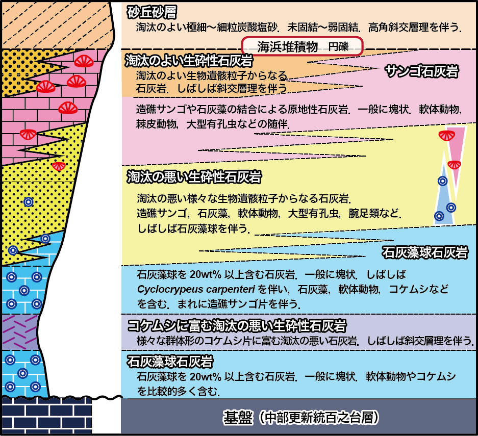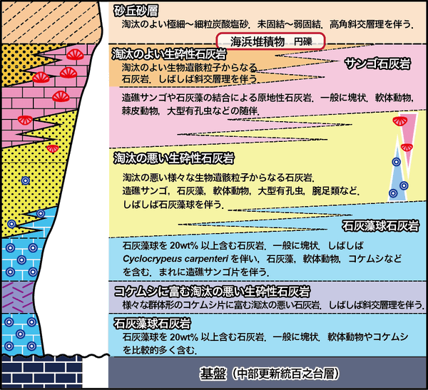 模式的な堆積シーケンス(図)は,①石灰藻球石灰岩(島棚域;水深50~150m)に始まり,②コケムシ質石灰岩(島棚外側〜斜面上部;水深130~170m)→③石灰藻球石灰岩(島棚域;水深50~150m)→④石灰藻球を伴う淘汰の悪い生砕性石灰岩→⑤サンゴ礫を含む淘汰の悪い生砕性石灰岩→⑥サンゴ石灰岩(礁斜面〜礁域;水深50m以浅)→⑦淘汰の良い生砕性石灰岩(浅礁湖;水深5m以浅),そして最上部は陸化し,⑧淘汰の良い細粒石灰砂層(風成砂丘;陸域)からなり,最終間氷期から最終氷期までの相対的海水準低下に伴う浅海化の過程で形成されたと推定される.また同時間面で見ると,上部更新統の基盤である中部更新統百之台層上面の地形と標高に応じて,岩相は側方に変化する.約80ka(MIS 5a)に注目すると,高位の中西台(現在の標高160m)には浅海域で堆積したサンゴ石灰岩と淘汰のよい生砕性石灰岩が,上嘉鉄北方(標高60~70m)には島棚域の石灰藻球を伴う淘汰の悪い生砕性石灰岩が,そして島西部や中部北西岸周辺(現在の標高10~35m)には,島棚上部〜斜面上部域で堆積したコケムシ質石灰岩が分布している.さらにその後の相対的海面低下に伴って,サンゴ石灰岩の分布域は,次第に標高の低い地域へと前進し,約50〜40kaには現在の標高20m前後の地域へとオフラッピングしている.