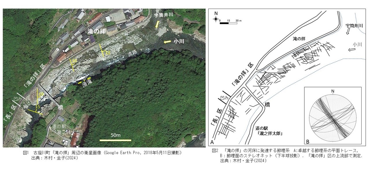 本論では,伊藤(1979)にならって,ポットホールを河流による侵食穴の総称とし,その分類名称も伊藤(1979)にしたがう.河流による岩盤河床 の侵食様式としては,一般に摩耗,プラッキング(剥ぎ取り),打撃,溶食があるが,これらのうち節理が発達した岩盤河床ではプラッキングによる侵食が極めて効果的であると指摘されている(Whipple et al., 2000).「滝の拝」のポットホールは,和歌山県の天然記念物に指定され,南紀熊野ジオパークのジオサイトにもあげられている.