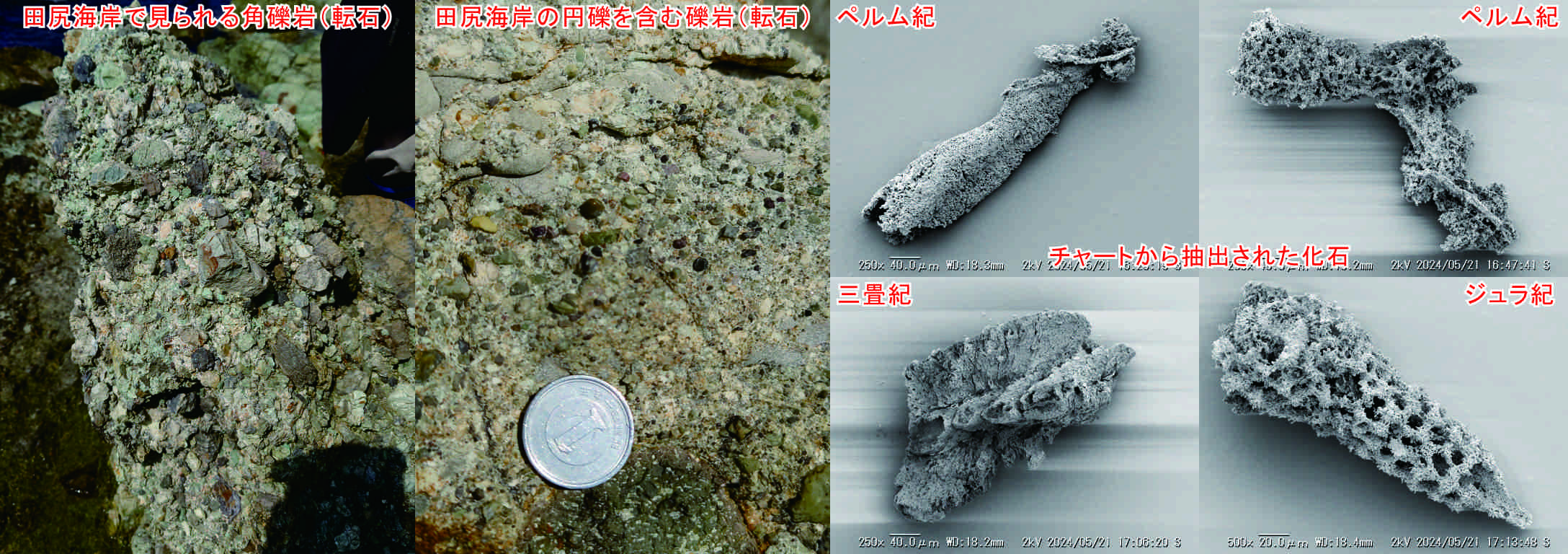 2023年8月,筆者らのうち水上 隆は,大田市の文化財にも指定されている珪化木の巨木が見られることでも知られる,大田市仁摩町の田尻海岸に転がる多数の礫の中に,チャートが存在するのではないかと考え,高校時代の同級生であった古谷 裕に確認を求めた.その後,水上 隆,水上恒子,古谷 裕の3名で2024年3月に田尻海岸を訪れ,海岸に転がる石ころの中から約20個のチャートを見いだした.そのチャートからフッ化水素酸処理により古生代ペルム紀から中生代ジュラ紀に及ぶ放散虫化石等が抽出された(図).