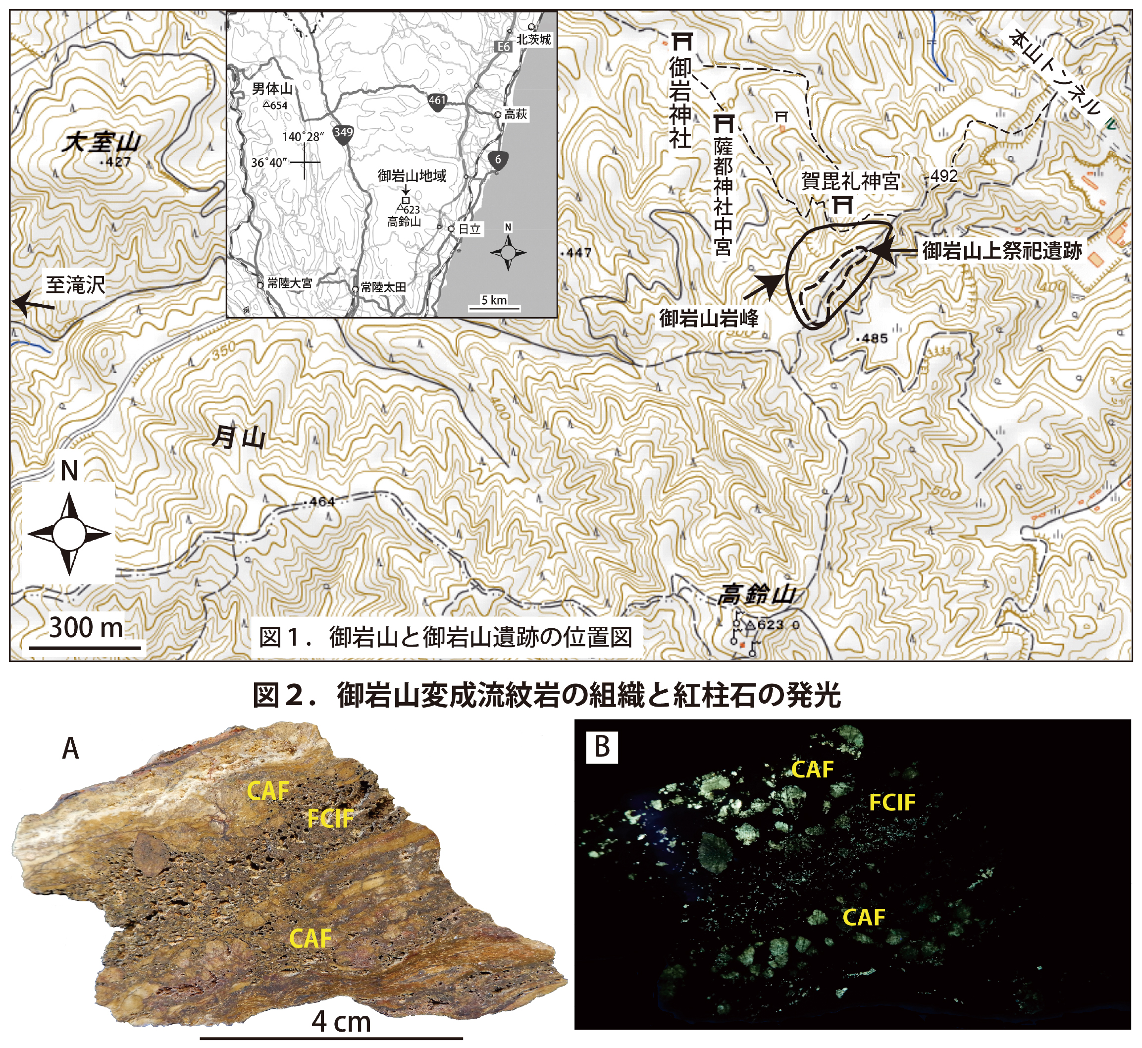 日立市の御岩山は常陸国風土記の「賀毘礼の高嶺」の遺称地とされ, 縄文土器などが発掘されることから, 古くから祭祀場所であったと考えられている. 現在は御岩神社の御神体として祠が多数祀られており, 御岩山上祭祀遺跡に指定されている (図 1). 御岩山変成流紋岩類はカンブリア系日立火山深成複合岩体に属し (田切ほか,2016), 御岩山岩峰を構成している. 粗粒紅柱石含有珪長質片岩 (CAF), 細粒紅柱石含有鉄鉱珪長質片岩 (FAIF), 紅柱石白雲母片岩と, 紅柱石を含まない白雲母片岩と珪長質片岩の5種の岩相で構成されている. CAF と FAIF が主岩相で, 互いに密接に共存して, 御岩山岩峰の中心部に広く分布する. CAFは緻密な乳白色の岩相で,FAIFは多孔質な赤褐色の岩相である (図 2A). FAIF は数cm幅の岩脈として CAF の流理に沿って貫入しており, しばしば流理を切ったり, 流動変形の頂部に濃集する. CAF と FAIF の境界部では FAIF の空孔が CAF に向かって細粒化しており, 急冷組織を示す. CAF と FAIF は同じ性格の化学組成であり, 構成鉱物も同じである. 主岩相のこのような産状は噴出流紋岩の火山組織を残していると判断される. その分布と産状から, 原岩は火山岩脈であり, 地表近い場所に貫入した火道火山岩と推定される. 白雲母片岩や珪長質片岩は流紋岩の砕屑物起源と思われる. 主岩相の主成分化学組成は過アルミナ質のもので, 原岩は紅柱石や珪線石をともなう過アルミナ質流紋岩 (Morgan, 1998; Belley & Broders, 2024) や S タイプ花崗岩 (Chappell and White, 2001) に相当する. 微量成分組成も同様の傾向を示す. 御岩山流紋岩類のマグマは, 大陸地殻が部分融解するような条件で生じたものと推定される. 御岩山変成流紋岩類は粗粒〜細粒の紅柱石を多量に含む岩相が大半を占める. 粗粒紅柱石は半自形や紡錘状の結晶としてCAF 中に, 細粒紅柱石は半自形の結晶として FAIF中に含まれる. 粗粒紅柱石の分布は極めて不均質で, 場合によっては研磨面の40 % が発光紅柱石で占められることから, 紅柱石またはその前駆結晶が火山岩の斑晶として晶出し, マグマの流動過程で不均質に分布するようになったことを示していると推察される. これらの紅柱石は強く紫外線発光する (図 2B). このような発光する岩石は本邦では他に報告がない. Webster, R., 砂川訳 (1980) によれば, 紅柱石の発光は一般に弱く, 宝石級の結晶のみよく発光するとある. また, X 線によっても発光することが知られている. CAF の同一の岩片中でも発光強度が異なる紅柱石があり, Fe 含量と発光強度が逆相関する. 御岩山には「エドガー宇宙飛行士が1971年2月の宇宙飛行の際, 宇宙船から御岩山が光るのを見た」という都市伝説がある. この都市伝説を調査すると, 1991 年 2 月にエドガー氏が御岩神社を訪問し, 当時の御岩神社宮司との懇談を発端に都市伝説が誕生発展した可能性があることが推察された. その背景には, エドガー氏のスピリチュアルな活動があり, 彼が日立市を訪問していたことが一層都市伝説に信憑性を持たせた. しかしながら, 発言に関わったと推定される 3 名の方々が既に亡くなっているため, どのような種類の光を見たのかは明らかにできなかった. 本報告した紫外線発光する紅柱石の光は, 都市伝説の光とは別のものである. しかし, 御岩山岩峰が紫外線発光する紅柱石を多量に含むことから, 都市伝説とは別に, 御岩山全体が発光する条件を科学的に検証するという新たな課題が生じた. 引用文献Belley, P.M. and J Broders. 2025. Mineralium Deposita, 1-19. Chappell, B. W., White, A. J. R. 2001. Australian Journal of Earth Sciences.48 : 489–499. Morgan, G.B., et al. 1998. Journal of Petrology, 39: 601-632. 田切ほか. 2016. 地質学雑誌, 122: 231-247. Webster, R.. 砂川訳. 1980. 「宝石学GEMS」.