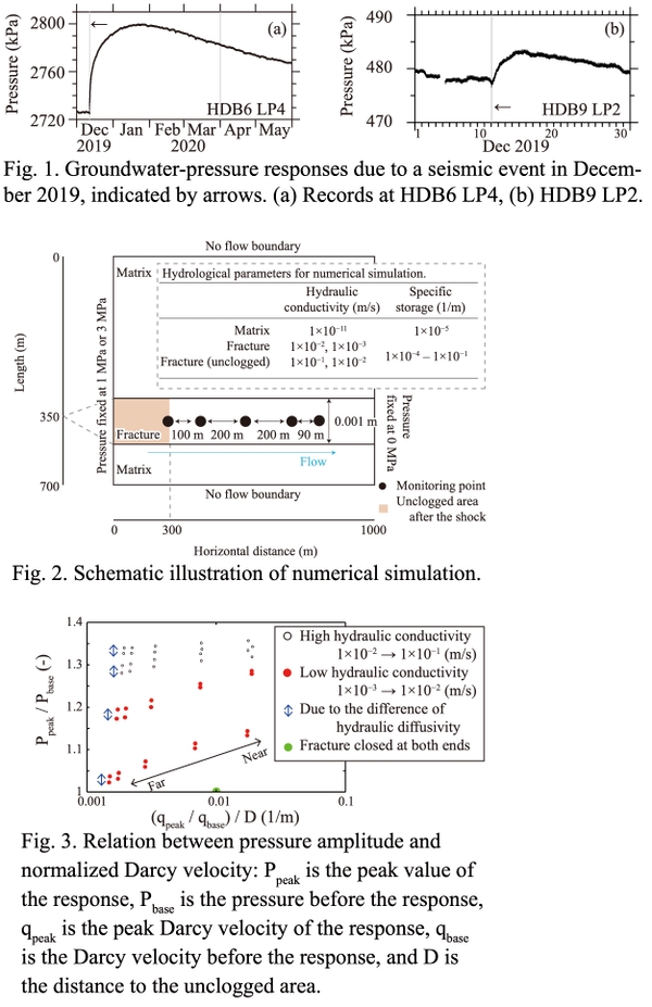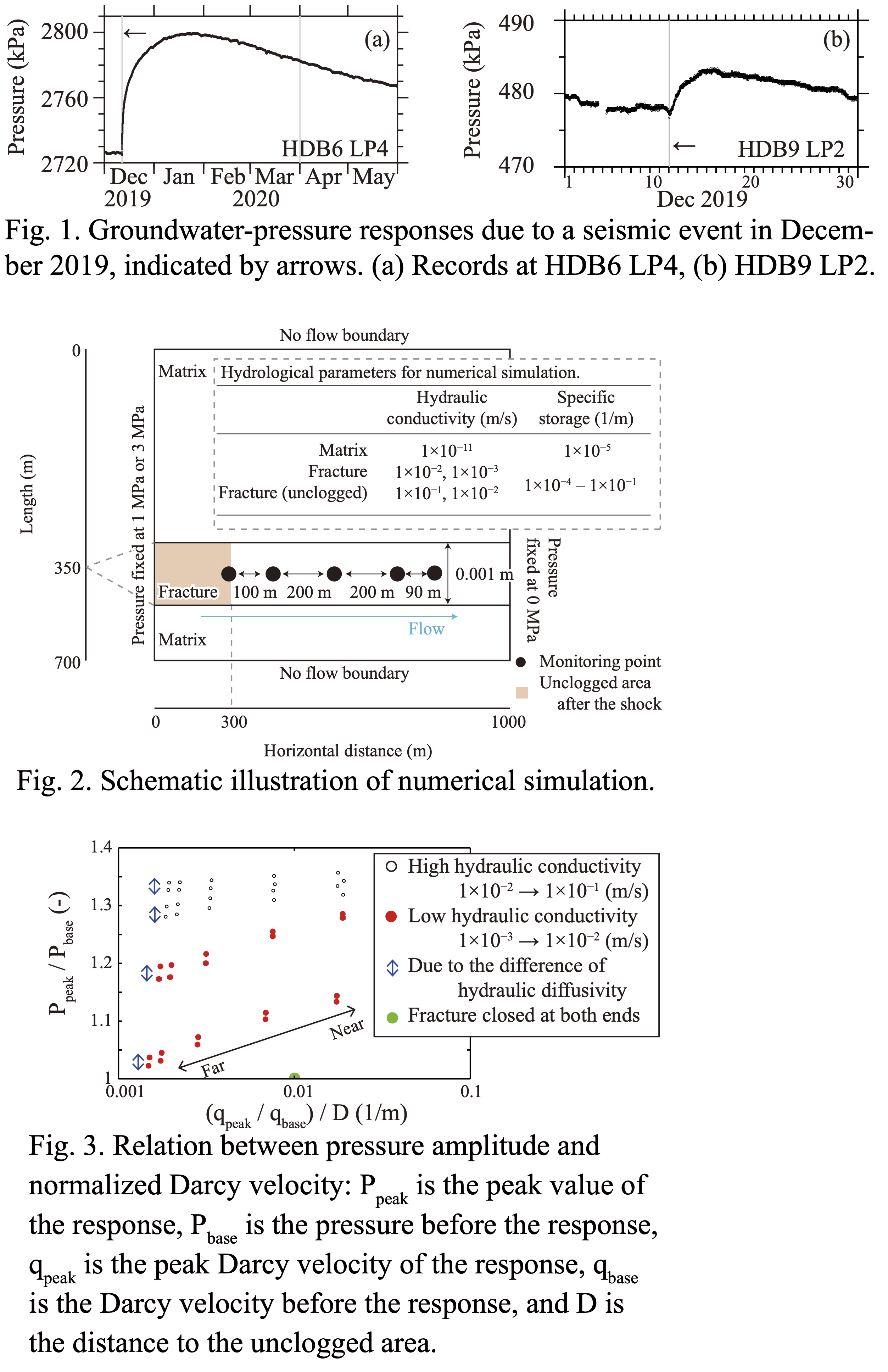 地下水圧観測結果と水理地質構造 地上から掘削された10本のボーリング孔における93箇所の地下水圧観測地点から得られた観測結果のうち、2019年12月に道北地方で発生した地震(Mw 4.2, 震源距離約10 km, 幌延町において震度4を観測)に対する水圧応答例として稚内層浅部における観測結果をFig. 1に示す。地震の発生後、徐々に水圧が増加し、数日〜1ヶ月後に最大値を示した後に元の水圧に向かって低下する様子が分かる。稚内層浅部は、割れ目の水理的連結性が高い(Ishii et al., Hydrogeol. J., 2025)。Fig. 1aに示されるHDB6のLP4は、深度291 m〜301 mに設置され、近傍に位置する幌延深地層研究センターの地下施設の建設に伴い、長期的に地下水圧が低下していることから、地下施設へ連結した割れ目を有し、比較的大きな動水勾配の下で地下水の流れが生じていることが分かる。Fig. 1bに示されるHDB9のLP2は、深度62 m〜68 mに設置され、割れ目と基質部の地下水の酸素水素同位体比から、連結した割れ目を通した地表水の移流浸透が指摘されている箇所である(Mochizuki and Ishii, Hydrogeol. J., 2022)。観測期間を通して地震動に対する有意な水圧応答が見られた全ての箇所は、割れ目の水理的連結性が高く、比較的大きな動水勾配により地下水の流れが比較的大きいことが推察される箇所であった。また、割れ目の水理的連結性が低く、地下水の流れがほとんど無いことが推察される箇所においては、水圧応答は見られなかった。