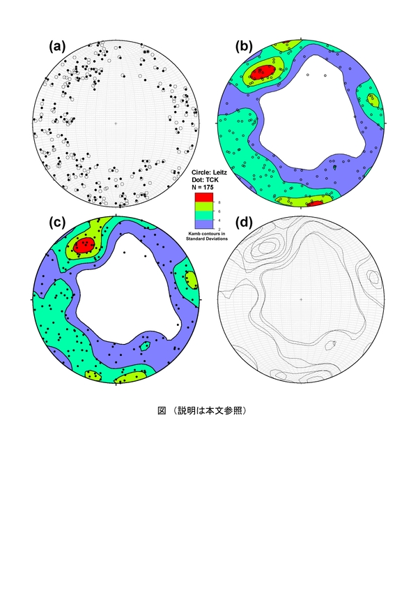 Takeshita (1995)で検討に供された薄片のうち1枚を用い,既存のLeitz製UステージとTCK製Uステージにより,石英中の175枚のFIPを比較測定した(図).図はFIPの極を下半球等積投影図に白丸(Leitz製Uステージ使用)と黒点(TCK製Uステージ使用)でプロットしたもの (図a),Kamb法によるコンターダイアグラム(図b:Leitz製使用,図c:TCK製使用),両者の等密度線を重ね書きしたもの(図d)である.この比較から,FIPsの方位を計測し統計的に扱う限りにおいて,TCK製UステージはLeitz製Uステージと同等の実用性を有する,すなわちユニバーサルステージが復刻できたと考えられる.会場では,測定傾斜角の補正に関する検討結果等とともに,可能な限り実機を展示することを予定している.