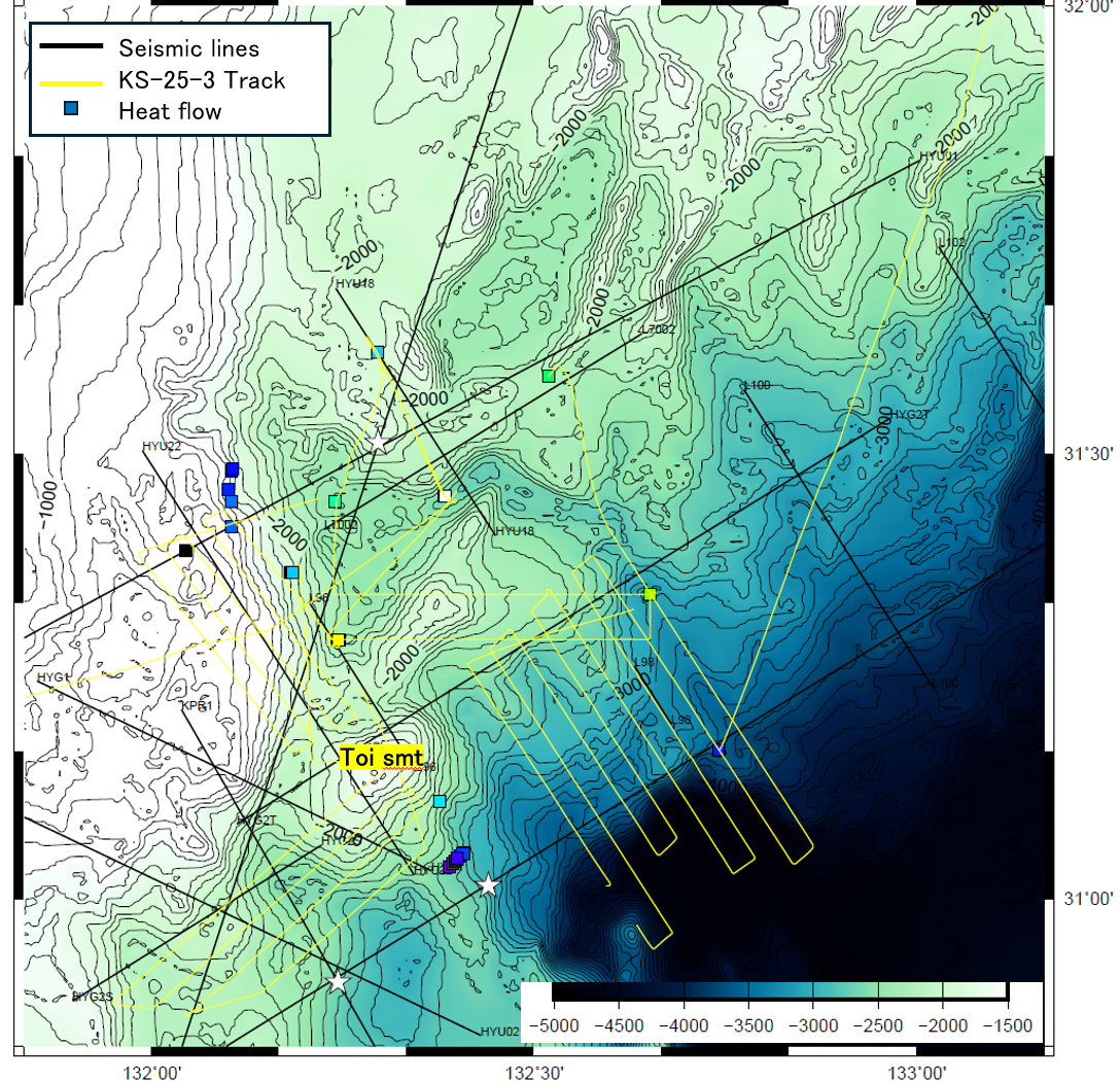 海山の沈み込みと上盤堆積物の相互作用により、両者とその境界面付近の応力場や有効強度は擾乱を受ける。それは巨大地震発生条件をmodifyし、おそらくは固着を弱めるであろう(Wang and Bilek, 2011など)。M8超の巨大地震発生が懸念される南海トラフの西端、日向灘周辺ではこれまでM8級の地震は発生していない。日向灘には、四国海盆と西フィリピン海盆の境界をなす、九州-パラオ海嶺(KPR)が沈み込んでいる。KPRとして沈み込んだ海山の周囲でスロー地震(微動・超低周波地震=VLFE・スロースリップ=SSE を総称)が時折発生し,震源位置が数十 km/day 程度で移動することが知られている。スロー地震の発生原因の一つが間隙水圧異常と提案されている(Takemura et al., 2023EPS; Ozawa et al., 2024JGR). 地下の流体(圧)異常を検出するためには、地震波解析から低速度層を検出し、かつ、科学掘削によりその場の間隙水圧を計測することが必要である。また上盤破砕帯などがあると、高圧の流体が破砕帯をつたって海底に湧出する可能性がある。 日向灘での反射法地震探査断面の解析により、BSR深度から熱流量が推定されている(Kinoshita et al., 2021 AGU)。海山の周辺では熱流量が40mW/m2を下回る低熱流量であり、特にLeading edgeでは20mW/m2といる超低熱流量が得られている。ただしこれらはBSR深度(海底下数百m)での熱流量であり、海底付近の局所的な水の流れや堆積等の擾乱は反映されないはずである。2021年8月(KS-21-18航海)および2025年4月(KS-25-3航海)に、日向灘での熱流量測定・コア採取・地形調査を行った(図)。プローブによる熱流量測定により33個の温度勾配が得られた。別途ピストンコアから得られた熱伝導率を用いて熱流量値を得ることができた。また沈み込んだ海山周辺の詳細な地形・表層構造が明らかになってきた。これまでに得られている反射法地震探査データから、日向灘沖で沈み込んだKPR(九州パラオ海嶺)上面の形状がある程度明らかになってきた。それを用いて海山上面でのSlip tendency (Ts)を推定し、前弧にあるToi smtのほぼ下にあるKPRの縁にそってTsが大きいことが示された(Kinoshita et al., 2025JpGU)。その場所のうち、特に北側(沈み込む前方側)でTremorなどが頻発している。地形およびSBPを精査した結果、Toi smtとその北側は、NNE-SSW走向のリッジやBasinが卓越している。おそらくは(海山沈み込みとは独立な)前弧付加体形成に伴うfrontal / imbricate thrustsであろうと推測する。そのような構造に対して、Toi smtの陸側(NW側)の地形がたかまっており、リッジが陸側にやや曲げられているように見える。SBPの記録と地形から、Toi smtの西の表層が圧縮性の構造が見て取れる。一方、海山のE~SE斜面には円弧滑りや地すべりと思われる地形が多数見受けられる。海山のNW側の地震構造でも逆断層的な構造がみえており、海山の沈み込みに伴う変形場が海底地形にも表れていると推測する。なお、海山の北(31°25-30’N)にある深海谷は、おそらく既存の断層性高まりを浸食していると考えられる。海底での熱流量計測の結果、限られた点数ながら、基本的には30-60 mW/m2 程度の低熱流量が観測された。一方、Toi smtの陸側、NE-SW方向に沿って、70 mW/m2を超える高熱流量が存在することが分かった。特に海山NEの海底谷において、300mW/m2を超える高い熱流量が観測されたのは特筆すべきである。低熱流量は,BSRから推定された値とほぼ整合的である。海洋地殻基盤(あるいはKPR)の形成年代)が古いことが一因と考えられる。一方、Toi smt陸側の高熱流量はBSRからの推定値とは整合しない。その原因としては、地形効果や堆積・浸食効果がありうるが、海山沈み込みによる周囲の応力異常・水理擾乱に起因する流体循環、特に地下の断層破砕帯を通じた局所的な流体上昇の可能性があるが、今回はコア試料の間隙水化学分析から特に流体上昇を示す証拠は得られていない。本発表では、このほかコア試料のCTや物性、記載などについても提示する予定である。なお本研究は科研費(基盤S、24H00020, 2024-2028) による。また東京大学大気海洋研究所の共同利用公募航海により実現した。感謝いたします。