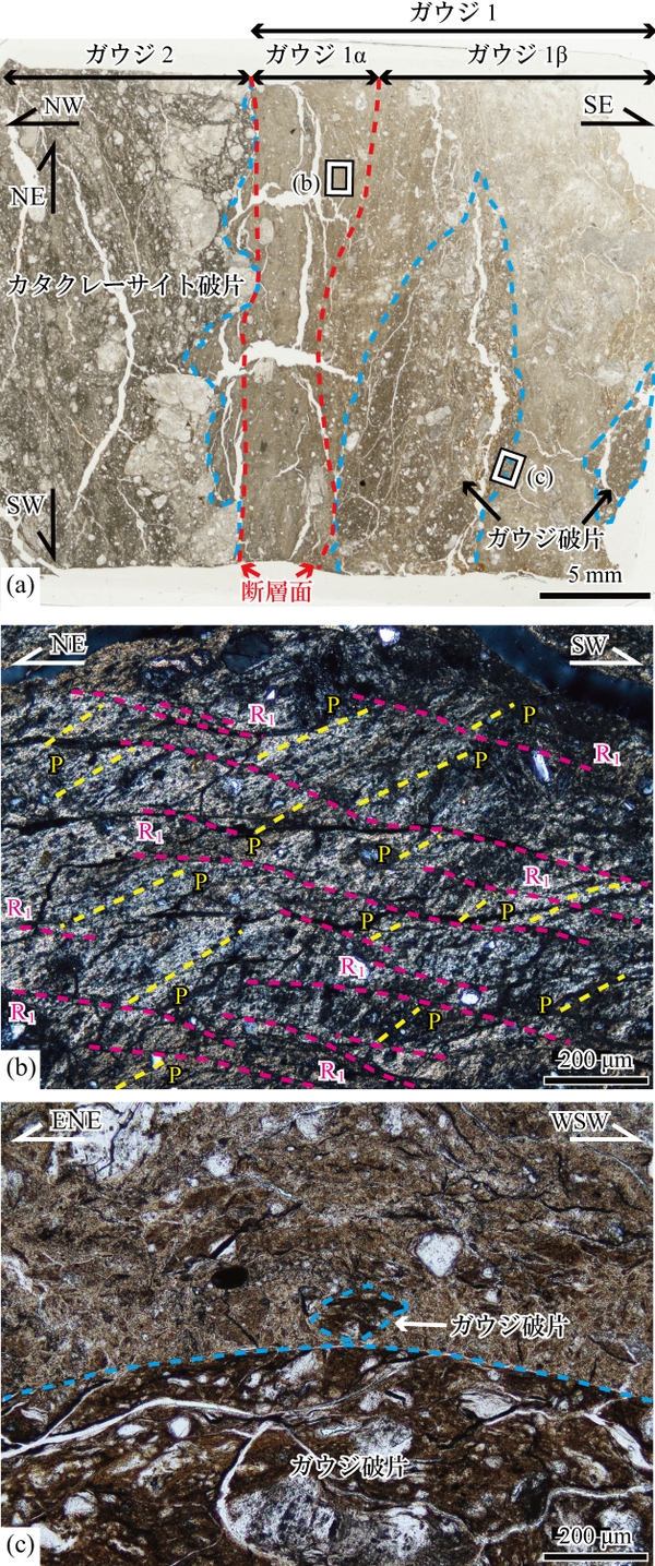 偏光顕微鏡観察:最新滑り面を含む試料を採取し,最新滑り面に直交で,条線(レイク角20° NE)に平行な面を持つ薄片を作成した.薄片内にはガウジ1および2と,2条の断層面が認められた(図1a).トレンチ調査で確認された最新滑り面はガウジ1とガウジ2を分けているため,2条の断層面のうち北西側の断層面がトレンチ調査で認めた最新滑り面に対応する.また,南東側の断層面は,最新滑り面より湾曲し,ガウジ1をガウジ1αとガウジ1βに分ける.ガウジ1αは粘土鉱物に富み,東側隆起成分を伴う右横ずれセンスを示すP面やR1面などの複合面構造が顕著に発達する(図1b).この運動センスは兵庫県南部地震時のそれと整合する.ガウジ1βは,ガウジ1αより粘土鉱物が少なく,東側隆起成分を伴う右横ずれセンスを示す複合面構造が軽微に発達する.また,ガウジ1αと異なり,ガウジ破片を含む(図1c).