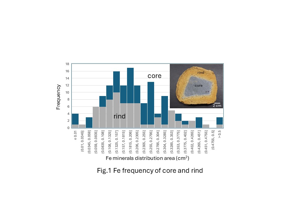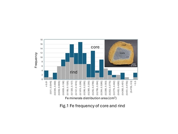 図1に風化殻と新鮮岩でFeの面積分布の頻度グラフを示した.両者ともに面積分布の頻度グラフはおおむね一致しており,風化殻生成前後で含鉄鉱物の分布面積が変化していないこと,すなわち岩石の体積が変化していない傾向が得られた.このことは密度を測定すれば元素濃度の違いから風化殻生成前後での元素の挙動がわかることを示している.元素濃度と密度計測の結果,風化殻で増加するものよりも減少する元素の方が多く,HREEよりもLREEの方が移動し難いこと,TiやZr , Feはほとんど移動しない元素に相当する傾向が得られた.