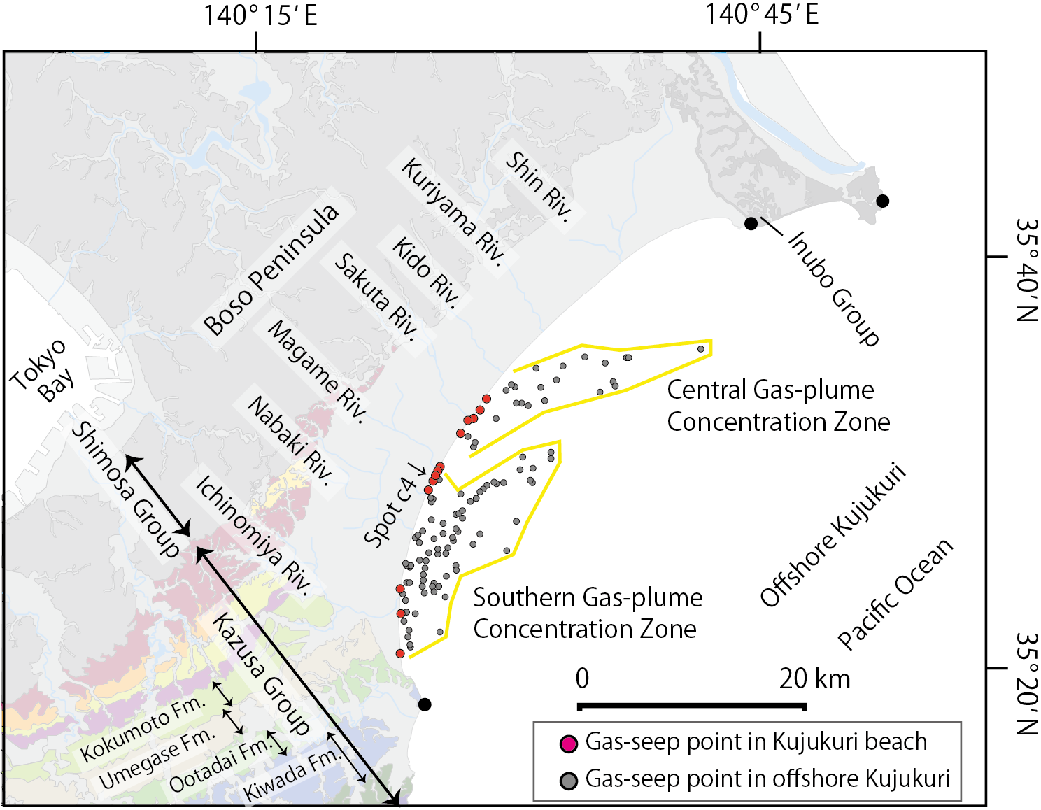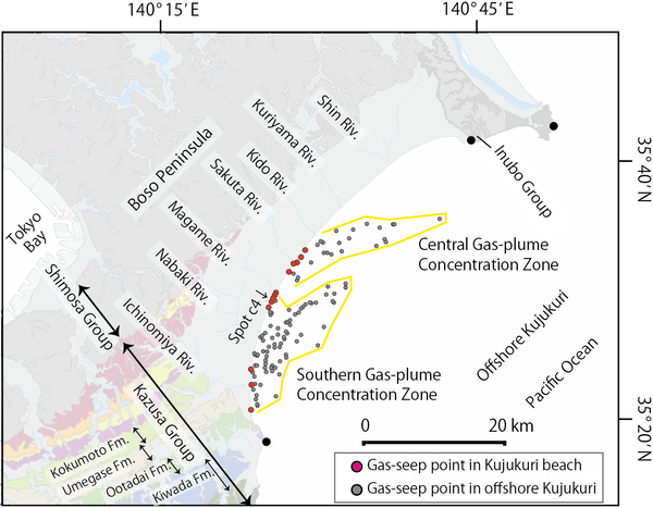 吉田ほか,2025, 房総半島九十九里沿岸域から湧出する天然ガスの産状と生物生産への影響に関する予察.地学雑誌,134. 293-307.