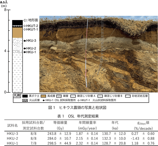 テフラ分析は,HKUT-1に約4万年前のKc-Srと約12万年前のKc-Hb(町田・新井,2003)の火山ガラスが混在していること,露頭中の火山灰層が約4千年前のMa-d1(岸本ほか,2009)に対比されることを明らかにした.