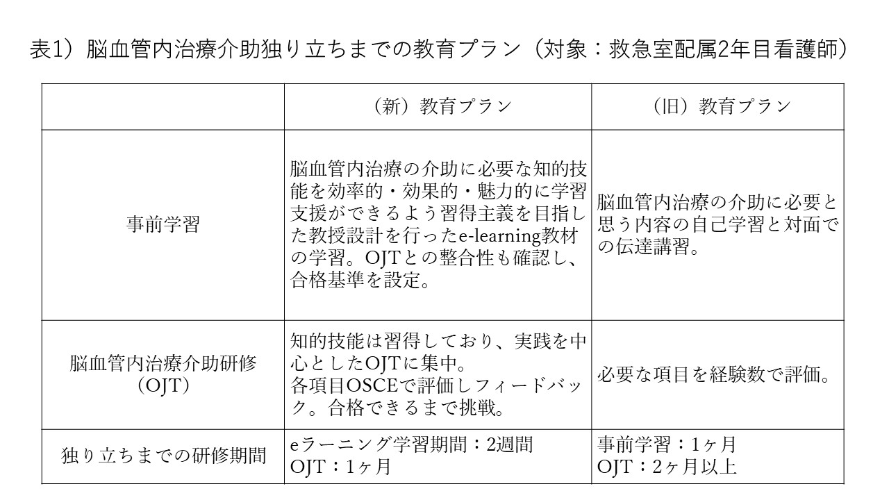 COVID-19の感染拡大に伴い、対面による集合研修や新人看護職員へのオリエンテーションなどは時間の短縮や方法の変更を余儀なくされている。特に新人教育では集合教育をせずに現場で必要な技術を学ぶことになり、例年通りに出来ていた技術習得が遅れることで技術不足への不安を抱く新人もいる。また、集合研修は新人同士の情報交換・共有できる場の一つでもあり、その機会が少なくなり、不安や孤独感を感じてストレスが解消されない新人も多い。その他、看護師養成機関では、臨地実習時間が減少した影響で、入職後の新人看護師は「看護技術」「看護記録などケア以外の業務」「患者さんとのコミュニケーション」での経験不足を挙げる声が多く、実際の臨床現場の看護師からは「患者さんとのコミュニケーション」「看護技術」「自信のなさや強い緊張」での経験不足などを指摘する声が上がっている。一方でICTでの教育は追い風になりeラーニングや遠隔授業など様々な便利なツールも出てきている。今では、ICTを活用して、集合研修やカンファレンス、会議、学会などを行うことが主流になってきており、看護教育にも欠かせないツールの一つとなっている。このような背景から、自部署ではICT、インストラクショナルデザイン、シミュレーション、OJTをそれぞれ駆使・連動させ臨床に直結するよう実務的・実践的な教育方法を実践している。自部署の看護師教育の実際の一部を紹介し、withコロナ時代に求められる教育方法について考えていく(表1)。脳血管内治療介助独り立ちまでの教育の特徴として、事前学習はインストラクショナルデザインに基づいたeラーニング教材へ移行し、習得主義を目指した設計を行った。脳血管内治療介助研修では、事前学習で脳血管内治療の介助に必要な知的技能は習得済みのため、実践を中心としたOJTを可能にし、指導者からも「事前知識があるので手技に集中して教えることが出来た」、「以前に比べてスムーズに手技を覚える」等という前向きな意見があった。結果的に、脳血管内治療介助の独り立ちまでの研修期間短縮にもつながった。このように、ICTとインストラクショナルデザインを駆使し、OJTとの整合性を確認し、評価・改善しながら進めることが、withコロナ時代に求められる教育方法の一つではないかと考える。