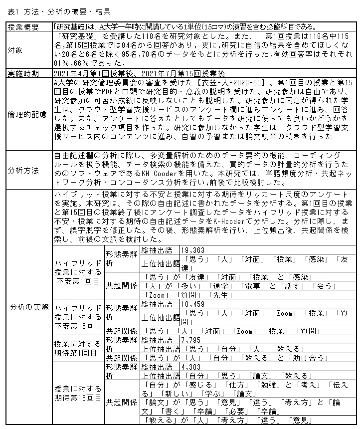 「不安」は上位頻出後・共起関係に表れなかった.「不安」の文脈には「友人ができない」や「友人と授業中にコミュニケーションが取れない」で表現された. 授業前の不安は①人が多い通学中の電車など感染の不安はあるが対策を行い,対面授業で友達を作り,人と直接会って話したい②Zoomだと先生に質問が難しく,すぐに回答がもらえるかが不安だという文脈であった.感染への不安はあるが,友人を作り,話す機会を欲しており,教員の質問返答即時性を望んでいた. 授業後の不安は①人と接しないようにしている反面②対面のほうが話しやすく,対面授業で友人作りや話がしやすい③Zoomでもスキル修得に不安がない反面,友人作りと先生への質問が難しい③対面授業で友人を作れ,話ができ,友人と協力し合って自分を成長させられるという文脈であった.演習は対面でもWebでもハイブリッドでもスキル修得に不安はないが,友人・教員とのインタラクションという意味で対面授業を望んでいた. 授業前の期待は,①先生はWebでも対面でも見ていてくれると思うから不安はなく,②考えや意見の違う人と教えあって自分を成長させたい③友人と授業の問題解決に助け合い協力することは大切だという文脈であった 授業後の期待は,①自分が難しいと感じた新しいことを共有し,学ぶことが大切②論文を書くことは卒論に役立つため必要で,そのスキルは意見の違う,考え方をみにつける③教えあうことで考え方の違う人の意見を学べたという文脈であった.