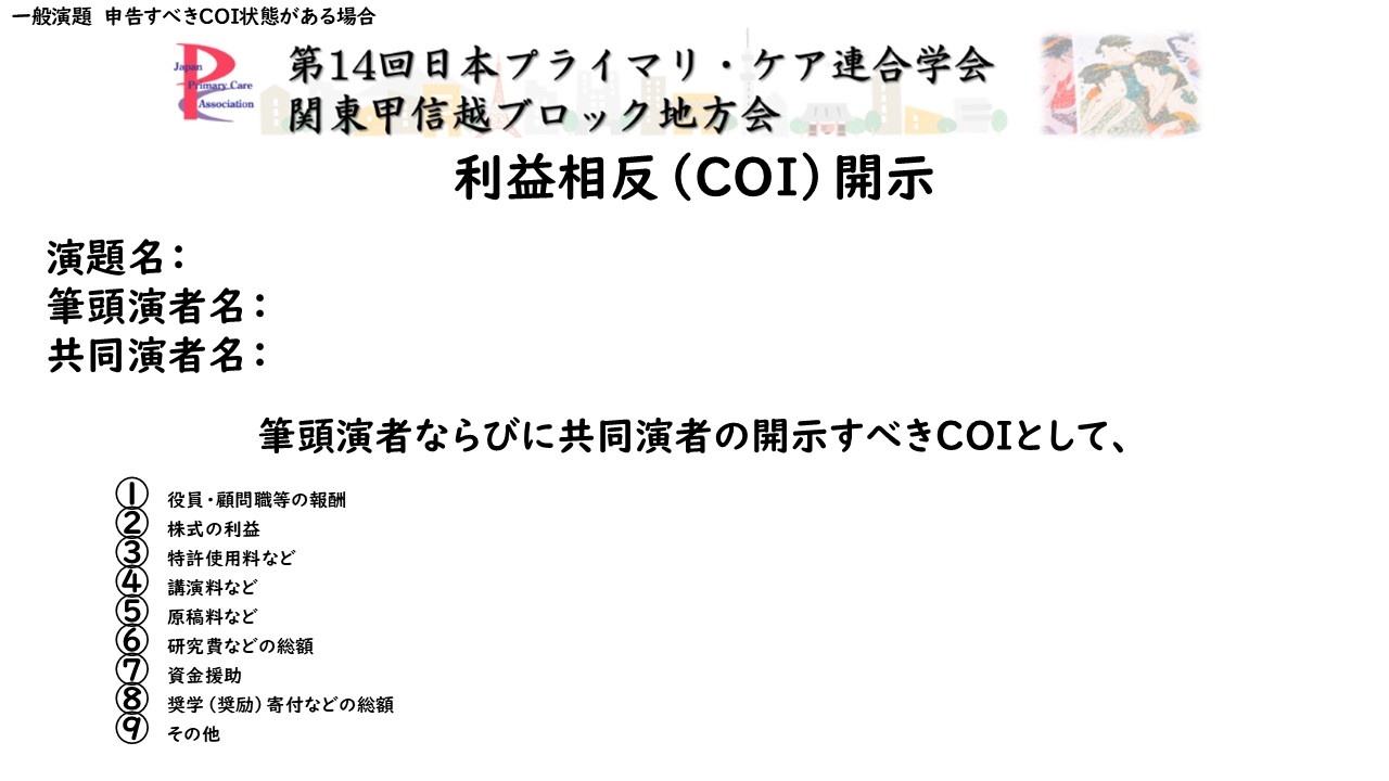 - 第14回ブロック地方会で講演 • 発表される筆頭演者は、利益相反の有無にかかわらず、利益相反の状態を申告する必要があります。