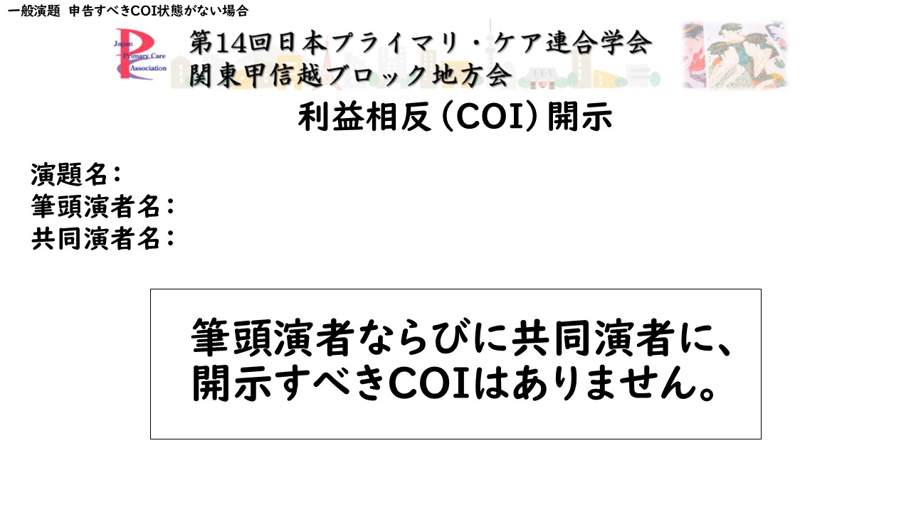 - 演題発表の際はタイトルスライドの次の2枚目に下記の利益相反の申告スライドを掲示してください。