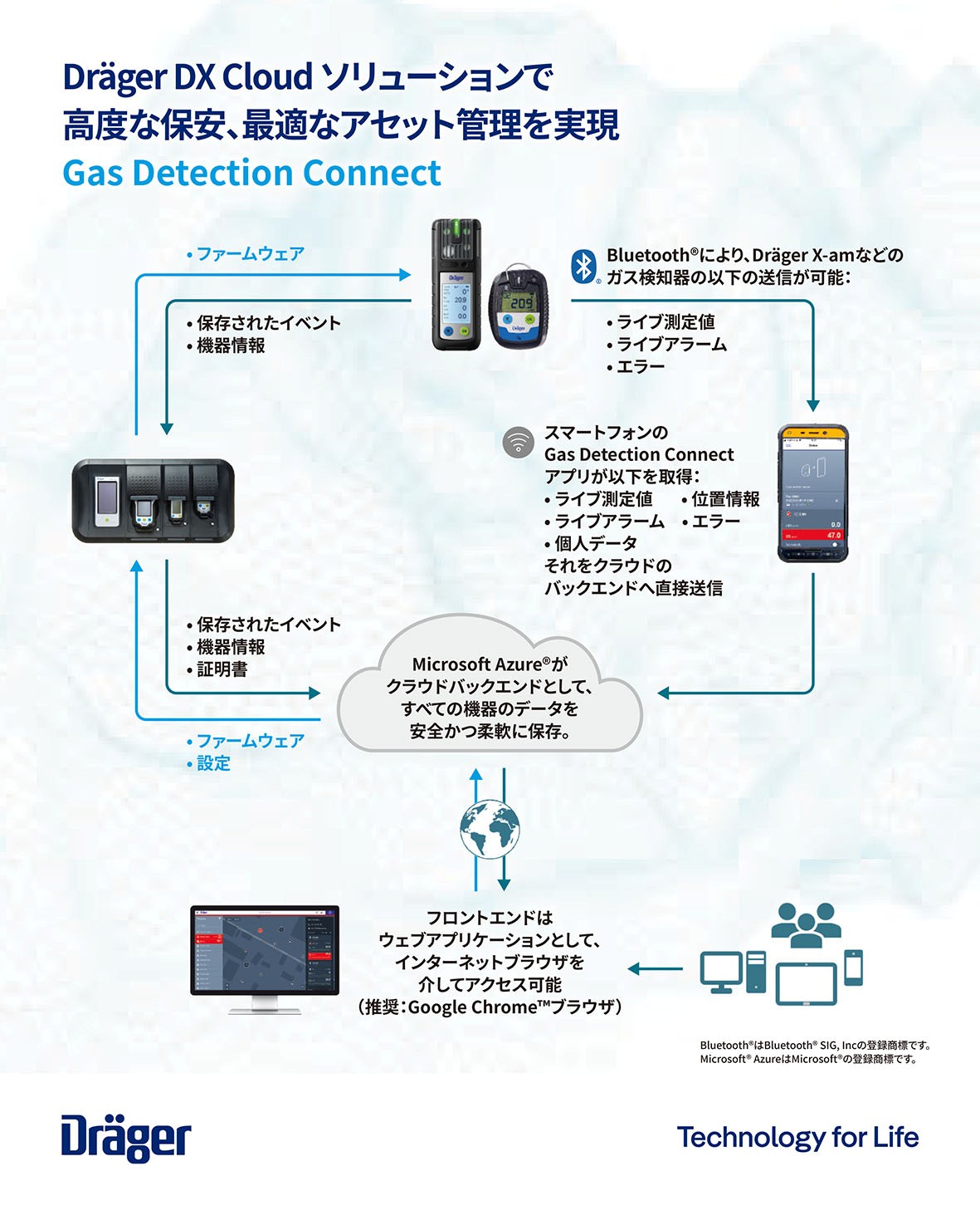 Gas Detection Connectは,デジタル化された労働安全衛生の未来とお客様をつなげます。 このシステムは,さまざまなドレーゲル製品を,スマートソフトウェアソリューションを介して接続することで,場所や時間に制約されずにアクセスできるため,機器を最適に管理し,ガス検知器と作業員の位置やステータスを常に把握することが可能です。 そのため,作業員を保護すると同時に,プラントの効率性向上にも寄与します。