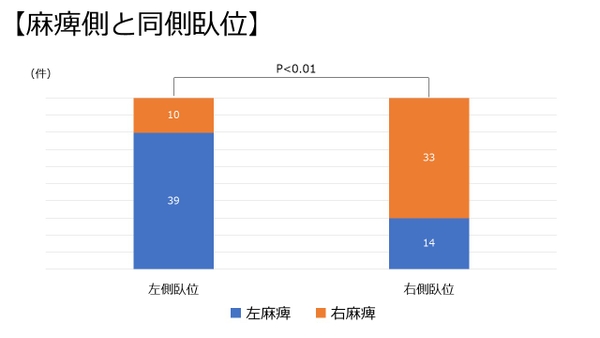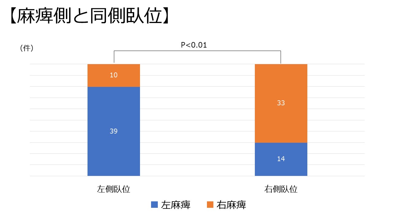 脳卒中患者では、救急隊接触時に麻痺側を下にした側臥位をとっていることが多く、麻痺の程度がより強いほど、その割合が有意に高かった。