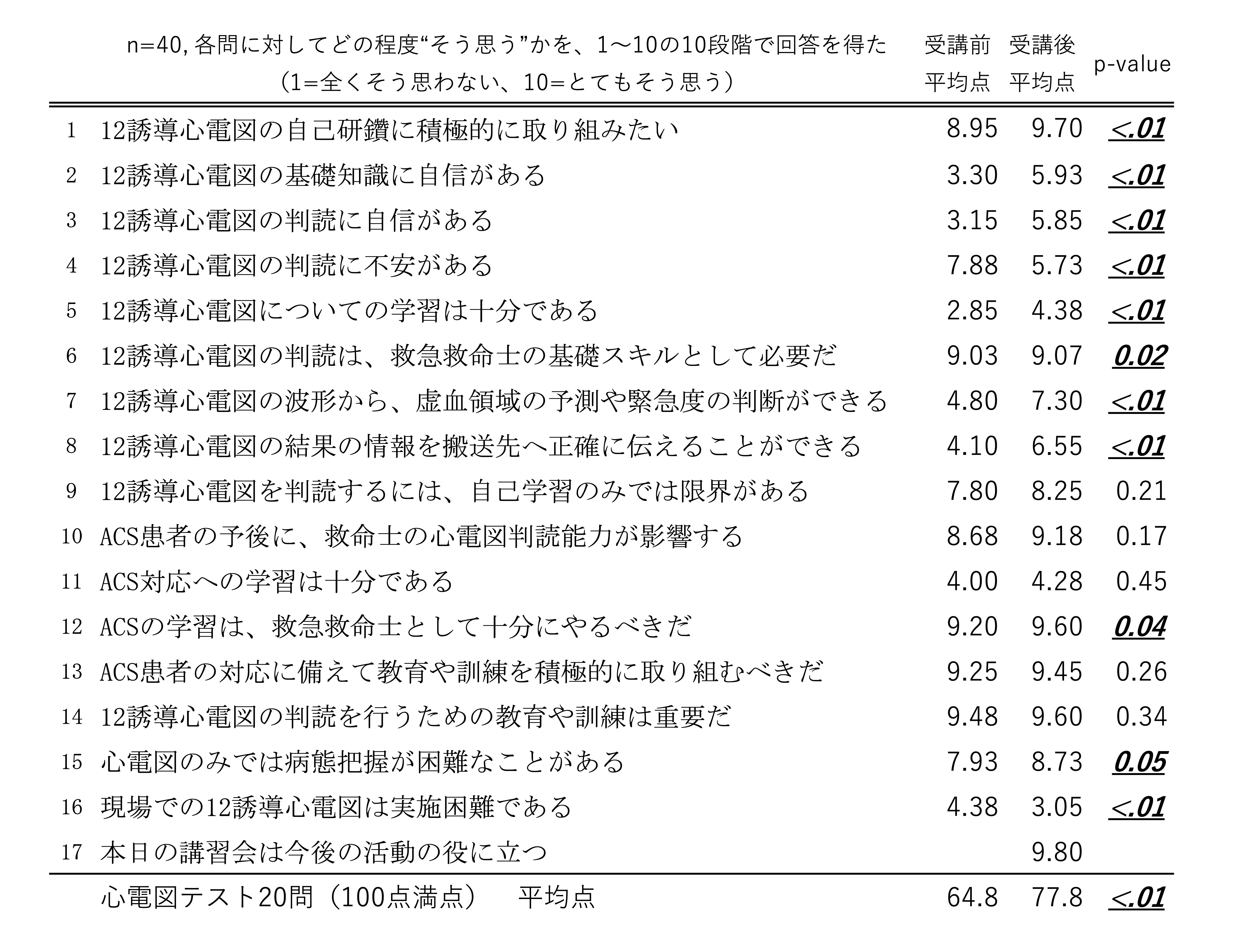 心電図テストの平均点は、受講後有意に上昇していた(64.8点 vs. 77.8点, p < 0.01)。アンケートでは受講前後で比較し有意に自信がつき、虚血領域の推定や選定先への正確な情報伝達に関しても有意に上昇していた(全てp < 0.01)。また全員が講習会内容を理解できたと回答し、内容も今後の活動に役立つと回答した。