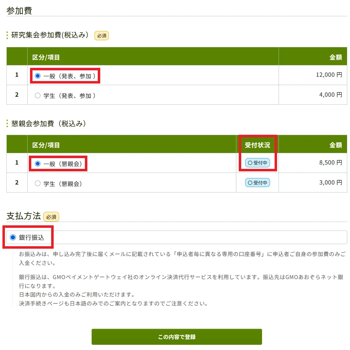 - 参加登録選択の画面で、研究集会(一般 12,000円)、懇親会(一般 8,500円)、支払方法(銀行振込)を選択し「この内容で登録」をクリックします。