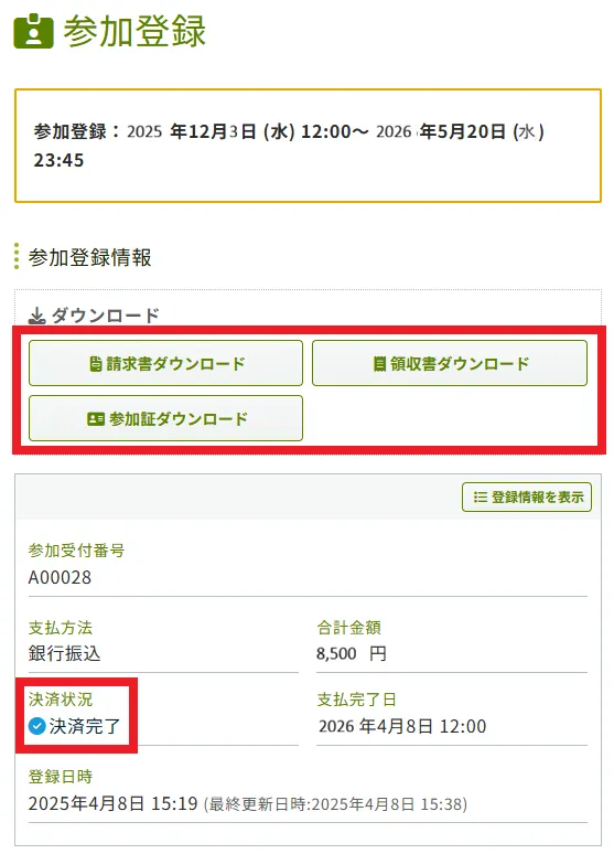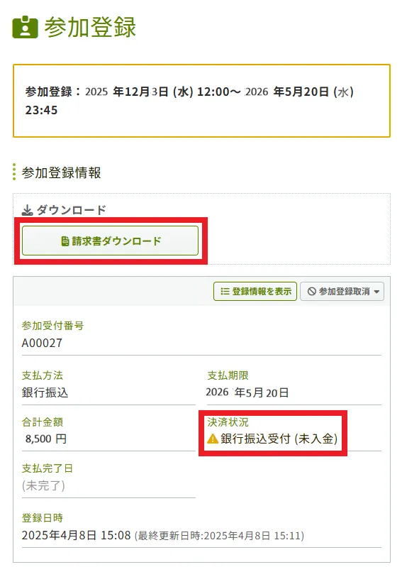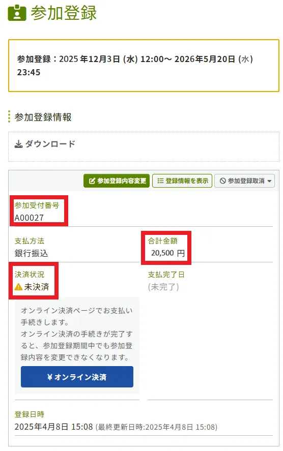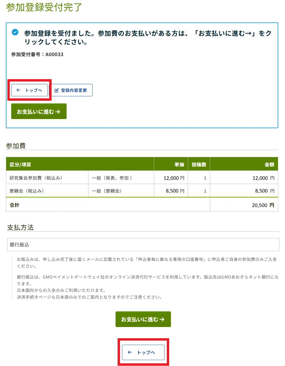 - トップ画面の参加登録欄で合計金額が20,500円、決済状況が未決済となっている事を確認し、「参加受付番号」と「参加者氏名」を担当幹事へお伝えください。