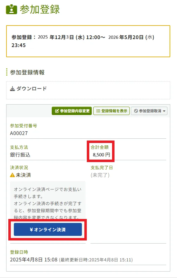 - 参加登録欄で合計金額が20,000円から8,500円に変わっている事を確認し、「オンライン決済」をクリックします。