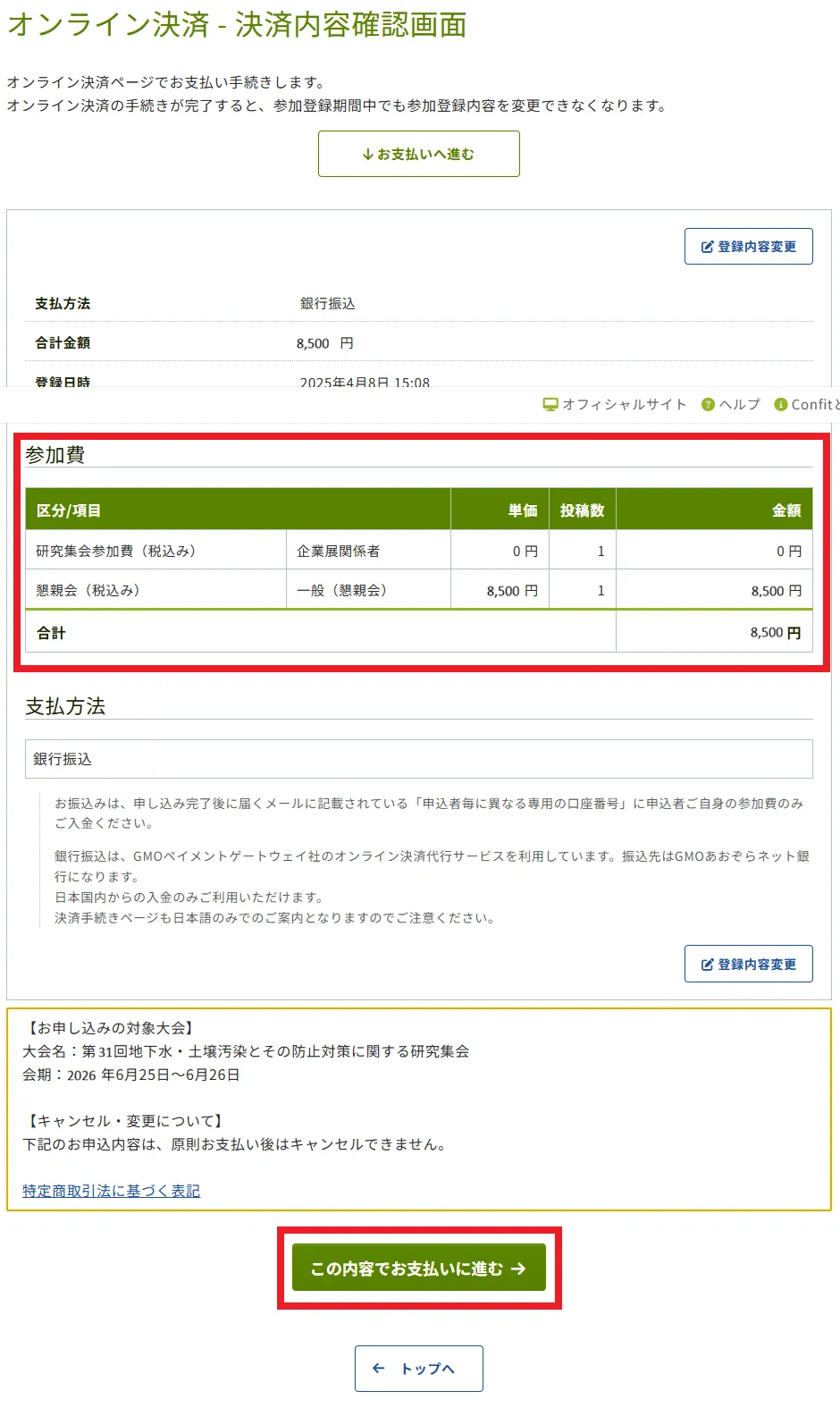 - 決済内容確認画面で研究集会参加費(企業展関係者 0円)、懇親会(一般 8,000円)、合計8,000円となっている事を確認し、「この内容でお支払いに進む」をクリックします。