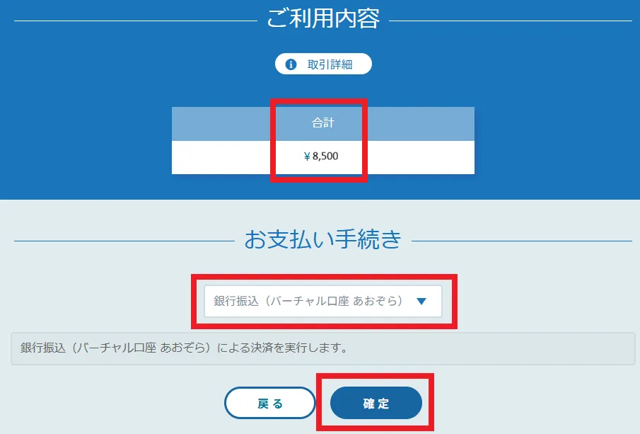 - ご利用内容の合計が8,500円、お支払い手続きが銀行振込(バーチャル口座 おおぞら)となっている事を確認し、「確定」をクリックします。