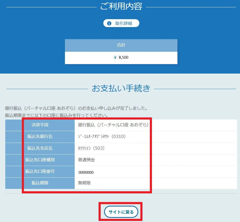 - 懇親会参加費のお振込み先バーチャル口座の情報が表示されますのでご確認頂き「サイトに戻る」をクリックします。