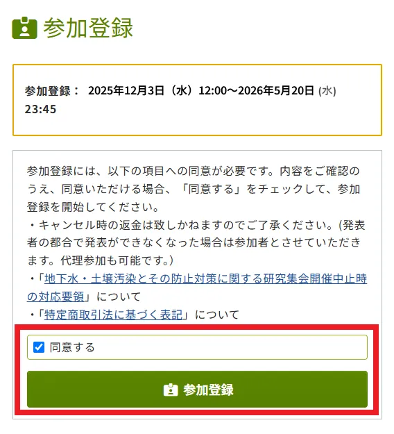 - 同意頂ける場合「同意する」をチェックし「参加登録」をクリックします。