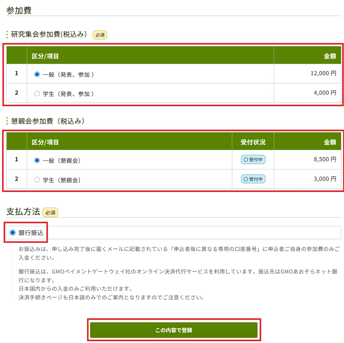 - 参加登録選択画面で、研究集会参加費の該当する区分を選択、支払方法(銀行振込)を選択し「この内容で登録」をクリックします。