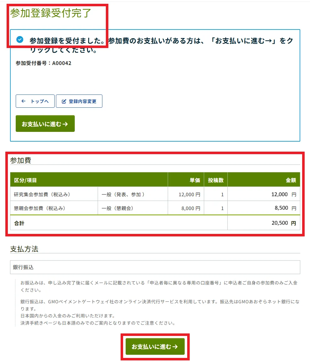 - 「参加登録受付完了」画面が表示され、「参加費」の内訳を確認し、問題が無ければ「お支払いに進む→」をクリックする。