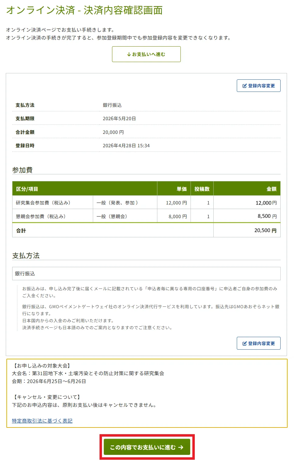 - 事前 参加費支払い方法:本システムに連携した「銀行振込」のみです。