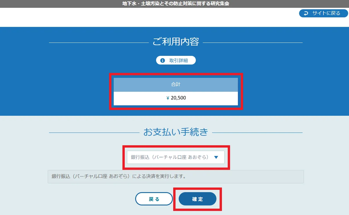 - 合計金額と「お支払い手続き」に「銀行振込(バーチャル口座 あおぞら)」が選択されている事を確認し「確定」をクリックする。