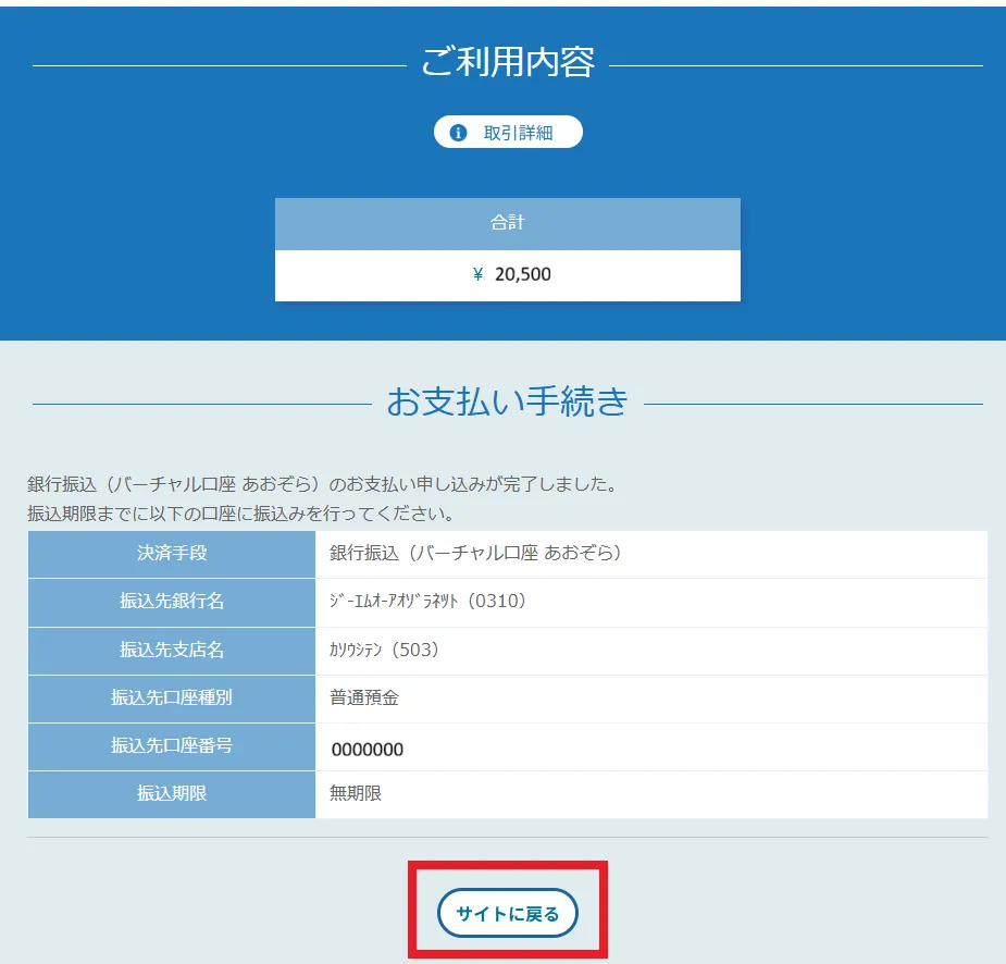- 参加費のお振込み先バーチャル口座の情報が表示されますのでご確認頂き「サイトに戻る」をクリックします。