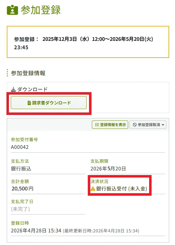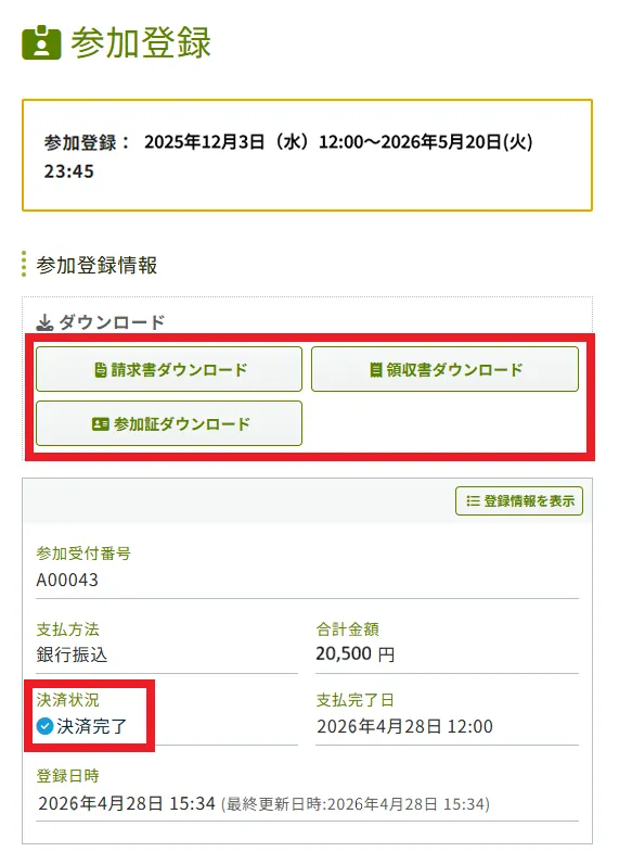 - お振込みが完了し、決済状況が「決済完了」に変わると「領収書」と「参加証」をダウンロードする事ができます。