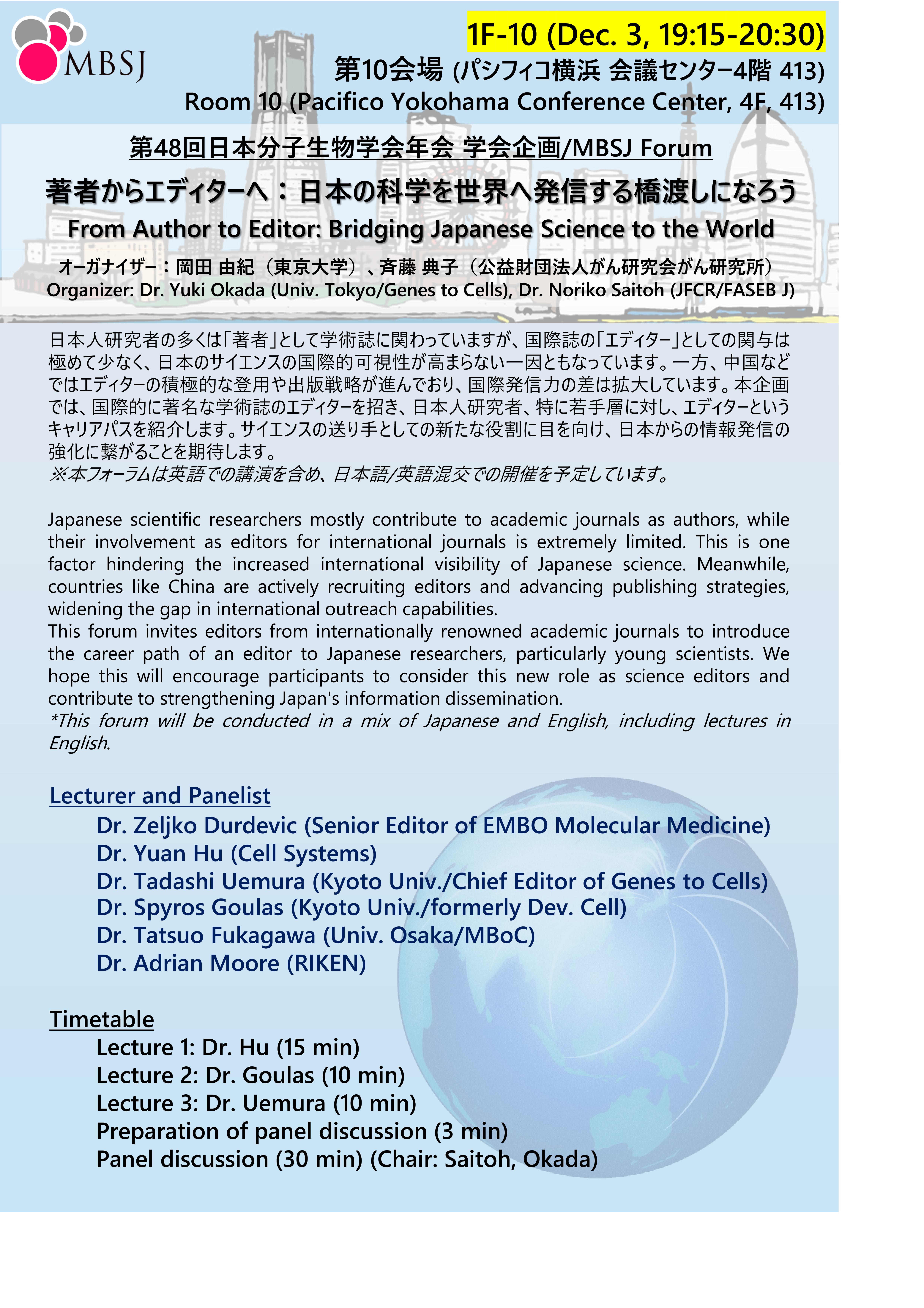 日本人研究者の多くは「著者」として学術誌に関わっていますが、国際誌の「エディター」としての関与は極めて少なく、日本のサイエンスの国際的可視性が高まらない一因ともなっています。一方、中国などではエディターの積極的な登用や出版戦略が進んでおり、国際発信力の差は拡大しています。本企画では、国際的に著名な学術誌のエディターを招き、日本人研究者、特に若手層に対し、エディターというキャリアパスを紹介します。サイエンスの送り手としての新たな役割に目を向け、日本からの情報発信の強化に繋がることを期待します。