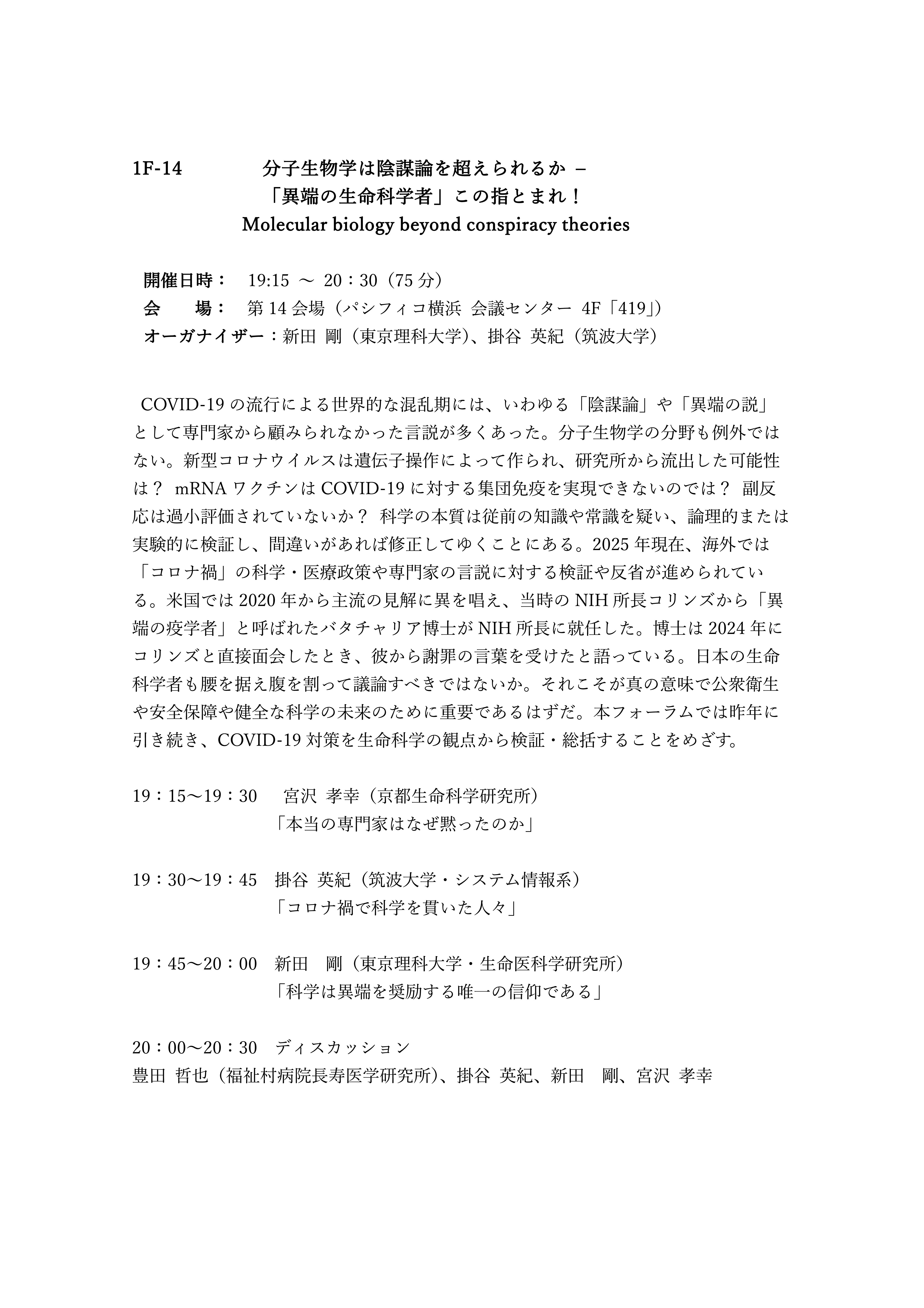 COVID-19の流行による世界的な混乱期には、いわゆる「陰謀論」や「異端の説」として専門家から顧みられなかった言説が多くあった。分子生物学の分野も例外ではない。新型コロナウイルスは遺伝子操作によって作られ、研究所から流出した可能性は? mRNAワクチンはCOVID-19に対する集団免疫を実現できないのでは?科学の本質は従前の知識や常識を疑い、論理的または実験的に検証し、間違いがあれば修正してゆくことにある。2025年現在、海外では「コロナ禍」の科学・医療政策や専門家の言説に対する検証や反省が進められている。米国では2020年から主流の見解に異を唱え、当時のNIH所長コリンズから「異端の疫学者」と呼ばれたバタチャリア博士がNIH所長に就任した。博士は2024年にコリンズと直接面会したとき、彼から謝罪の言葉を受けたと語っている。日本の生命科学者も腰を据え腹を割って議論すべきではないか。それこそが真の意味で公衆衛生や安全保障や健全な科学の未来のために重要であるはずだ。本フォーラムでは昨年に引き続き、COVID-19対策を生命科学の観点から検証・総括することをめざす。