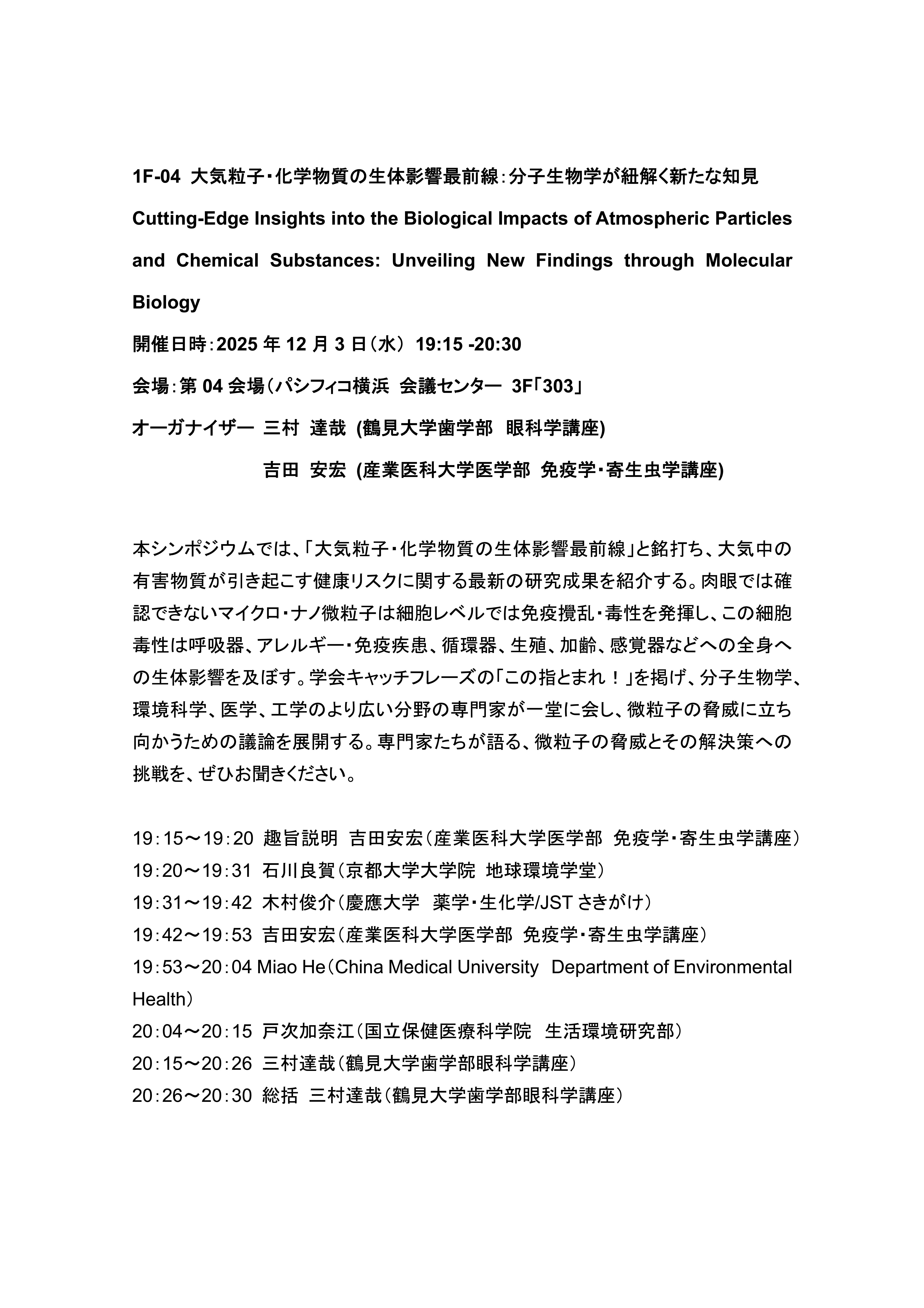 本フォーラムでは、「大気粒子・化学物質の生体影響最前線」と銘打ち、大気中の有害物質が引き起こす健康リスクに関する最新の研究成果を紹介する。肉眼では確認できないマイクロ・ナノ微粒子は細胞レベルでは免疫攪乱・毒性を発揮し、この細胞毒性は呼吸器、アレルギー・免疫疾患、循環器、生殖、加齢、感覚器などへの全身への生体影響を及ぼす。学会キャッチフレーズの「この指とまれ!」を掲げ、分子生物学、環境科学、医学、工学のより広い分野の専門家が一堂に会し、微粒子の脅威に立ち向かうための議論を展開する。専門家たちが語る、微粒子の脅威とその解決策への挑戦を、ぜひお聞きください。