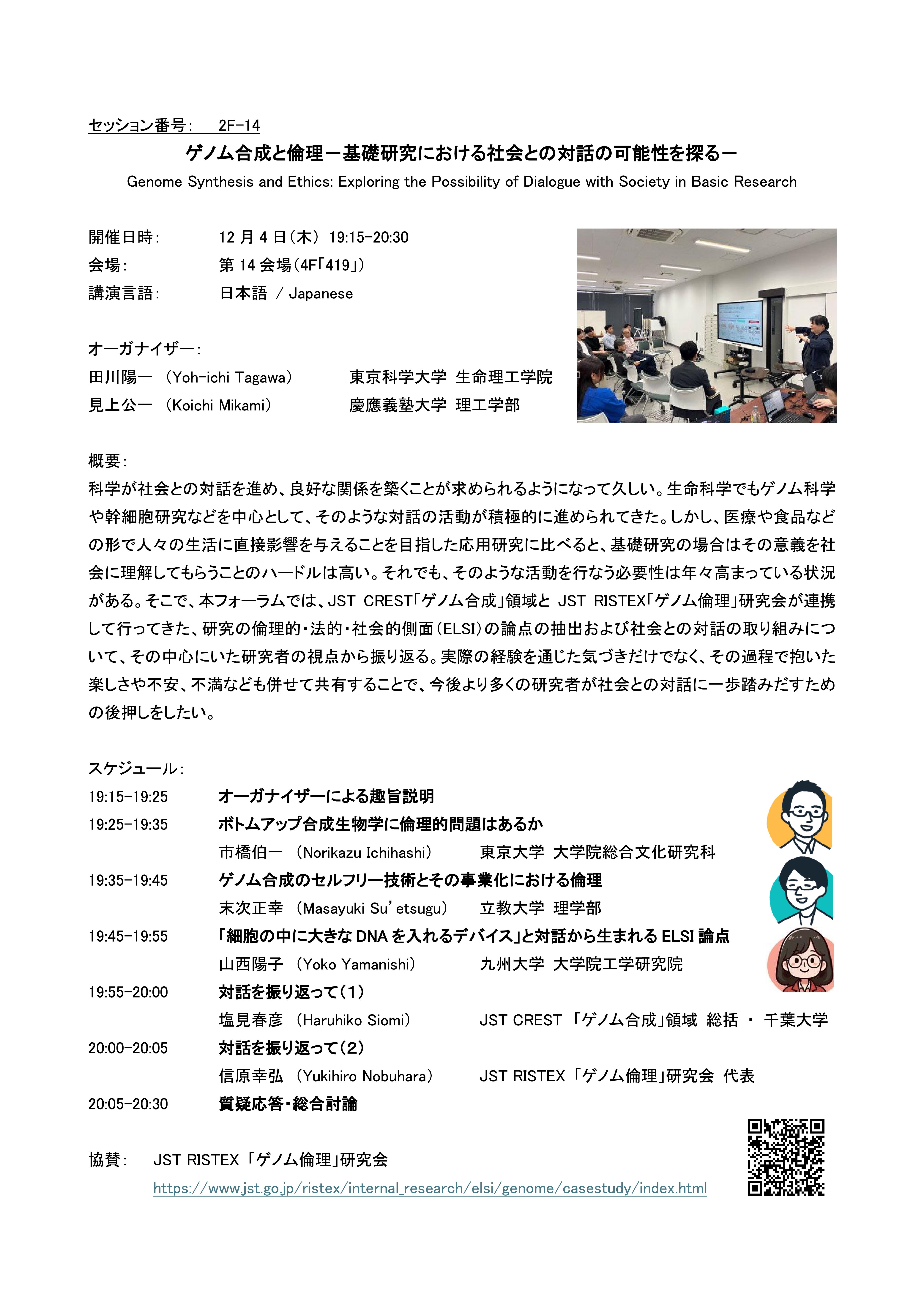 [2F-14]【J】ゲノム合成と倫理-基礎研究における社会との対話の可能性を探る-