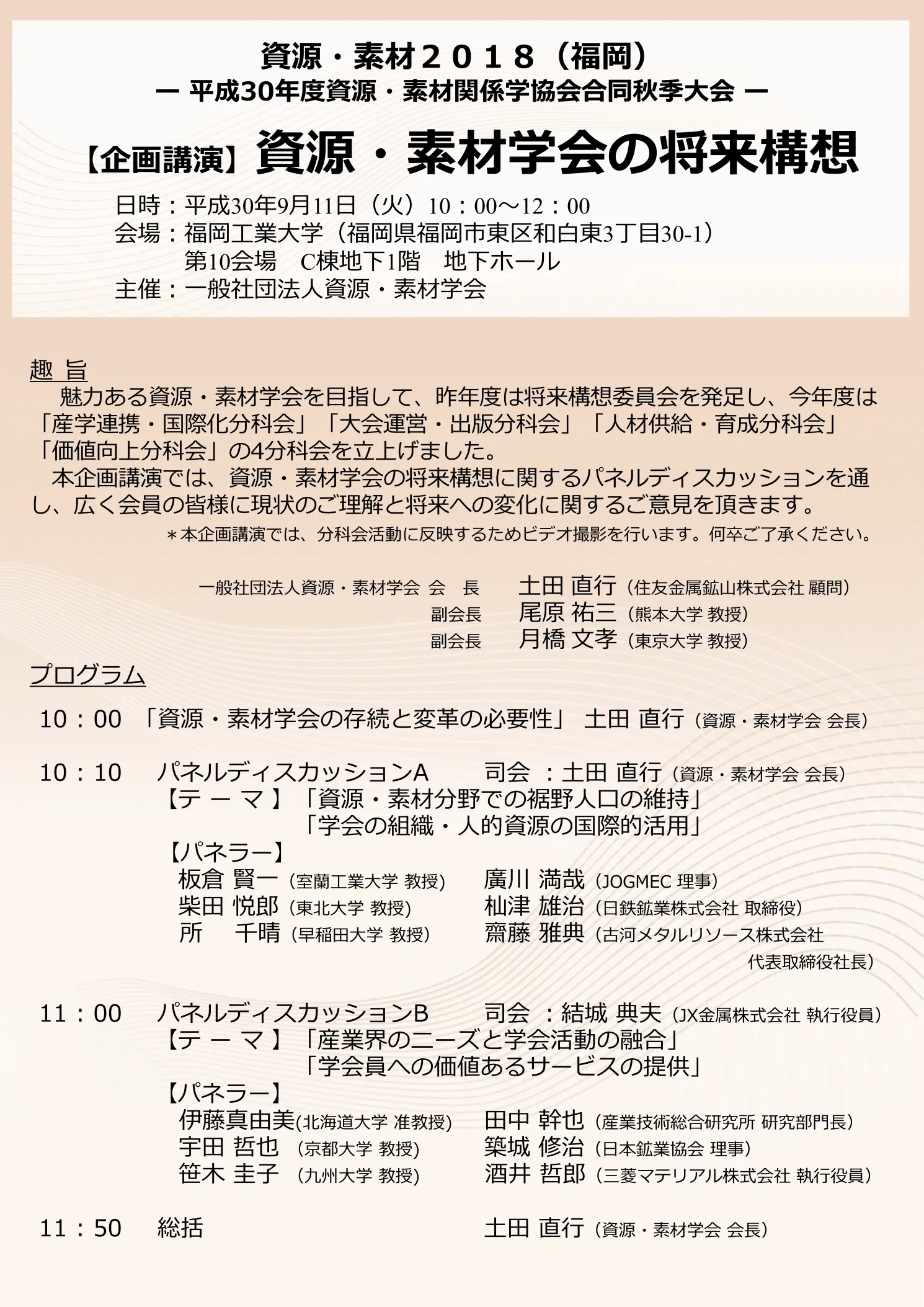 つきましては、今般、本企画講演にて、資源・素材学会の将来構想に関するパネルディスカッションを通し、広く会員の皆様に現状のご理解と将来への変化に関するご意見を頂きたく存じます。