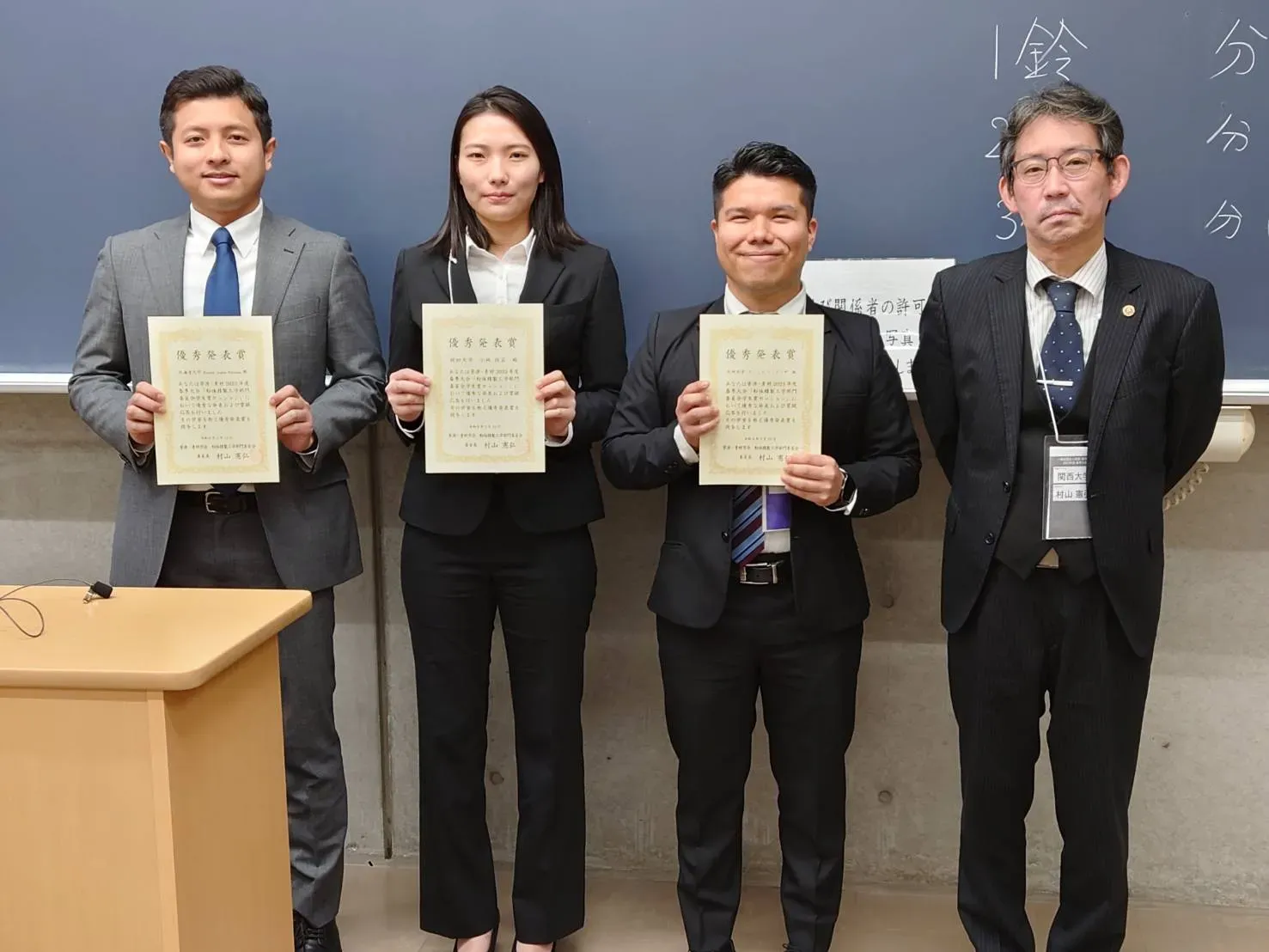 受賞者の皆さん(左3名)と粉体精製部門委員会:村山委員長(右)