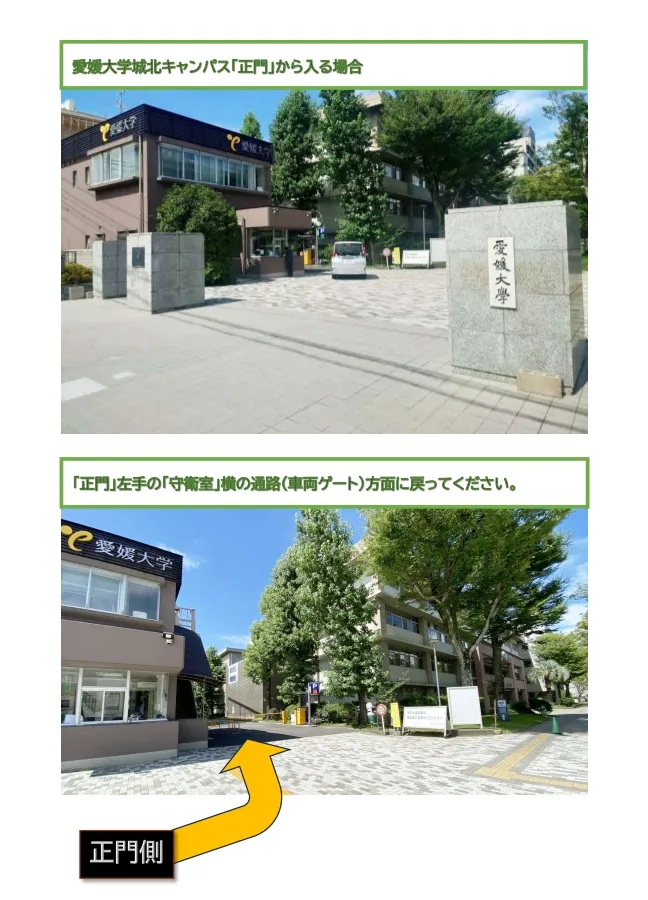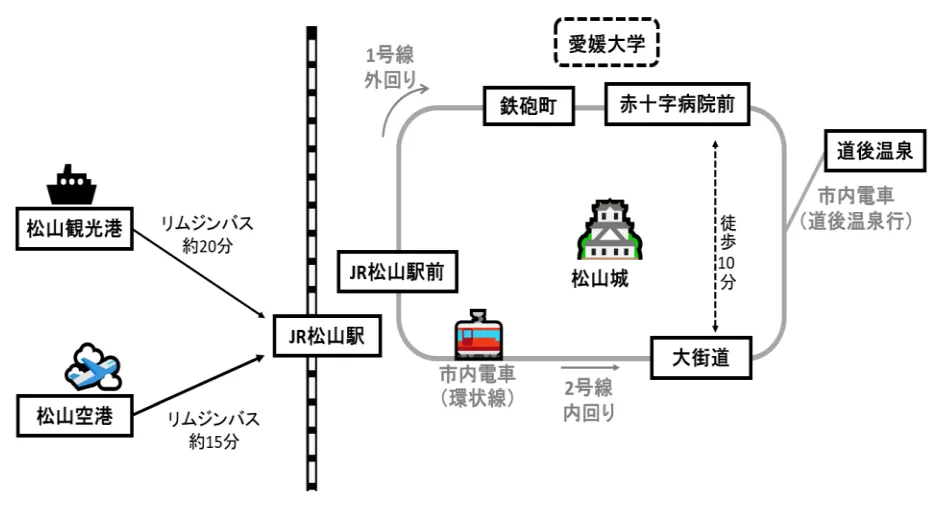 「赤十字病院前」駅で下車し、愛媛大学 城北キャンパスの「東通用門」より入構 ※「鉄砲町」駅で下車し「西門」からの入構も可能