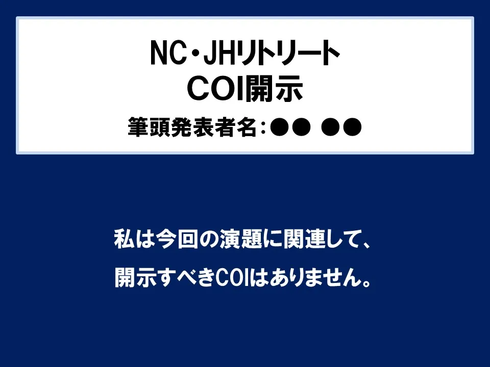 - 本企画での発表を行う際は、演題応募から過去3年間における筆頭演者の利益相反状態の有無を開示していただきます。(共同著者のCOIについても一括して筆頭演者が開示すること)